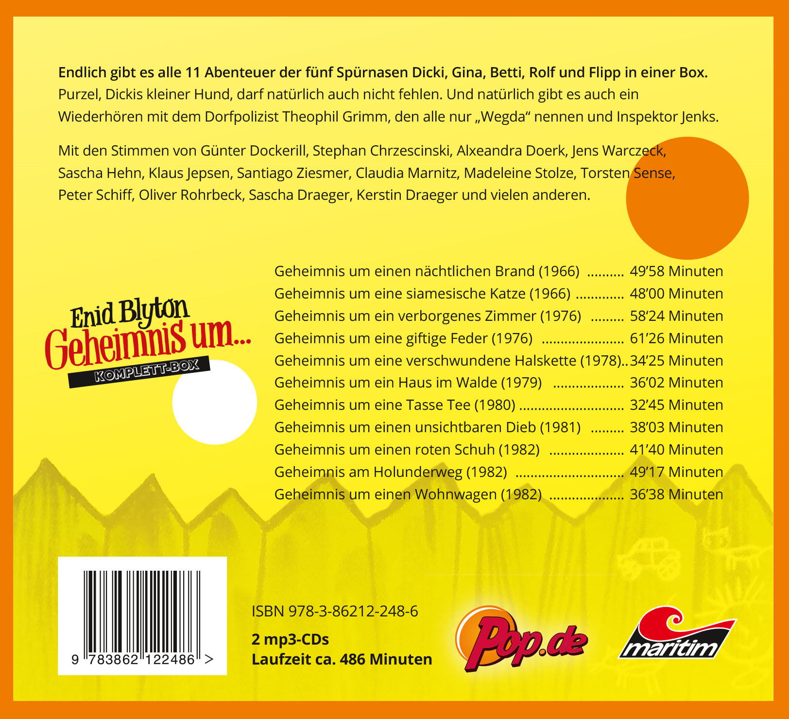 Endlich gibt es alle 11 Abenteuer der fünf Spürnasen Dicki, Gina, Betti, Rolf und Flipp in einer Box. Purzel, Dickis kleiner Hund, darf natürlich auch nicht fehlen. Und natürlich gibt es auch ein Wiederhören mit dem Dorfpolizist Theophil Grimm, den alle nur Wegda nennen und Inspektor Jenks.