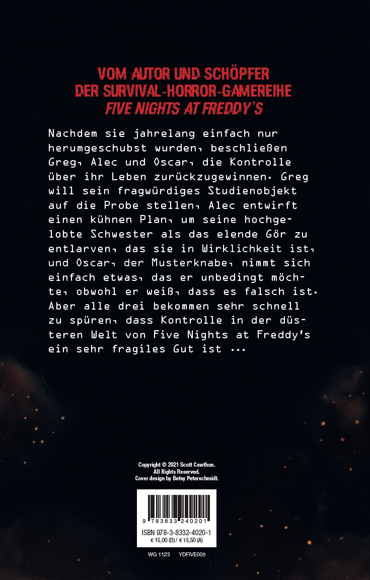 VOM AUTOR UND SCHÖPFER DER SURVIVAL-HORROR-GAMEREIHE FIVE NIGHTS AT FREDDY'SNachdem sie jahrelang einfach nur herumgeschubst wurden, beschließen Greg, Alec und Oscar, die Kontrolle über ihr Leben zurückzugewinnen. Greg will sein fragwürdiges Studienobjekt auf die Probe stellen, Alec entwirft einen kühnen Plan, um seine hochgelobte Schwester als das elende Gör zu entlarven, das sie in Wirklichkeit ist, und Oscar, der Musterknabe, nimmt sich einfach etwas, das er unbedingt möchte, obwohl er weiß, dass es falsch ist. Aber alle drei bekommen sehr schnell zu spüren, dass Kontrolle in der düsteren Welt von Five Nights at Freddy's ein sehr fragiles Gut ist ...