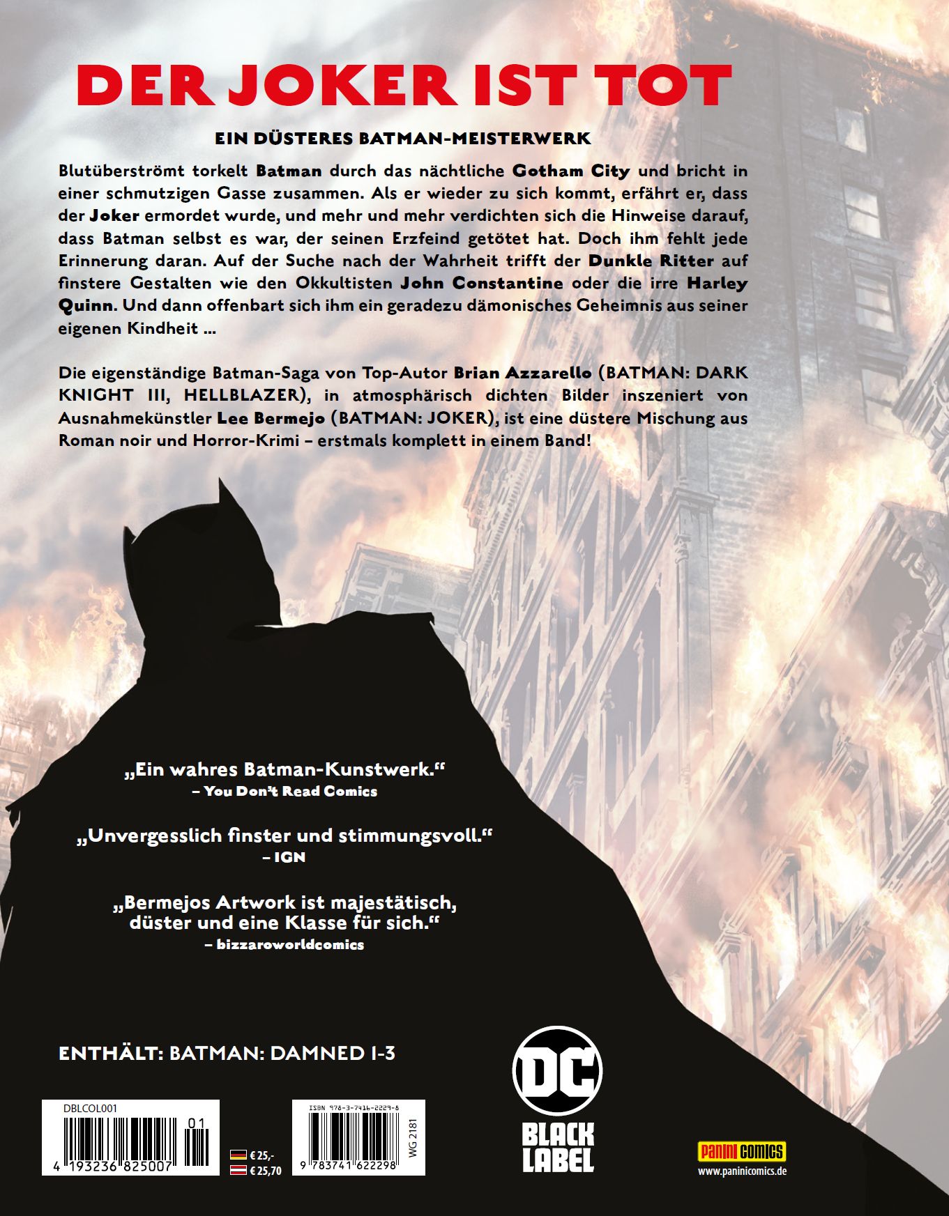 JOKER IST TOTEIN DÜSTERES BATMAN-MEISTERWERKBlutüberströmt torkelt Batman durch das nächtliche Gotham City und bricht in einer schmutzigen Gasse zusammen. Als er wieder zu sich kommt, erfährt er, dass der Joker ermordet wurde, und mehr und mehr verdichten sich die Hinweise darauf, dass Batman selbst es war, der seinen Erzfeind getötet hat. Doch daran fehlt ihm jede Erinnerung. Auf der Suche nach der Wahrheit trifft der Dunkle Ritter auf finstere Gestalten wie den Okkultisten John Constantine oder die irre Harley Quinn. Und dann offenbart sich ihm ein geradezu dämonisches Geheimnis aus seiner eigenen Kindheit ...Die eigenständige Batman-Saga von Top-Autor Brian Azzarello (BATMAN: DARK KNIGHT III, HELLBLAZER), in atmosphärisch dichten Bilder inszeniert von Ausnahmekünstler Lee Bermejo (BATMAN: JOKER), ist eine düstere Mischung aus Roman noir und Horror-Krimi - erstmals komplett in einem Band!Enthält: Batman : Damned 1-3