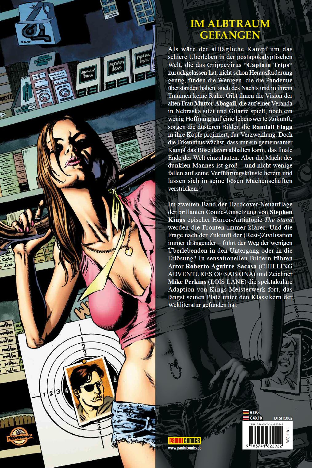 IM ALBTRAUM GEFANGENAls wäre der alltägliche Kampf um das schiere Überleben in der postapokalyptischen Welt, die das Grippevirus "Captain Trips" zurückgelassen hat, nicht schon Herausforderung genug, finden die Wenigen, die die Pandemie überstanden haben, auch des Nachts und in ihrem Träumen keine Ruhe. Gibt ihnen die Vision der alten Frau Mutter Abagail, die auf einer Veranda in Nebraska sitzt und Gitarre spielt, noch ein wenig Hoffnung auf eine lebenswerte Zukunft, sorgen die düsteren Bilder, die Randall Flagg in ihre Köpfe projiziert, für Verzweiflung. Doch die Erkenntnis wächst, dass nur ein gemeinsamer Kampf das Böse davon abhalten kann, das finale Ende der Welt einzuläuten. Aber die Macht des dunklen Mannes ist groß - und nicht wenige fallen auf seine Verführungskünste herein und lassen sich in seine bösen Machenschaften verstricken.Im zweiten Band der Hardcover-Neuauflage der brillanten Comic-Umsetzung von Stephen Kings epischer Horror-Antiutopie The Stand werden die Fronten immer klarer. Und die Frage nach der Zukunft der (Rest-)Zivilisation immer drängender - führt der Weg der wenigen Überlebenden in den Untergang oder in die Erlösung? In sensationellen Bildern führen Autor Roberto Aguirre-Sacasa (CHILLING ADVENTURES OF SABRINA) und Zeichner Mike Perkins (LOIS LANE) die spektakuläre Adaption von Kings Meisterwerk fort, das längst seinen Platz unter den Klassikern der Weltliteratur gefunden hat.