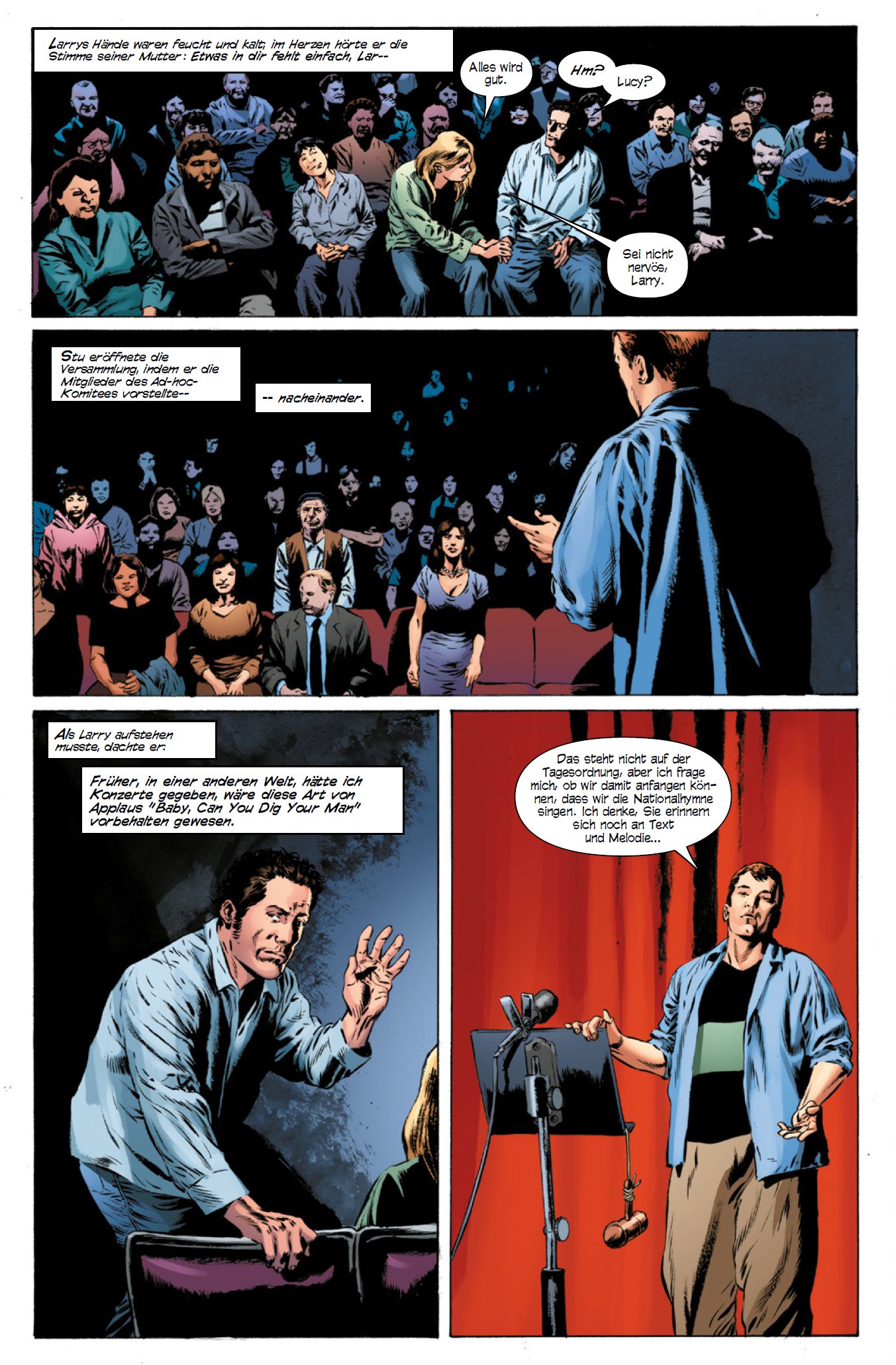 MEISTER DER APOKALYPSE von Arnulf Woock Als er 1978 The Stand veröffentlichte, war Stephen King als Autor bereits alles andere als ein unbeschriebenes Blatt. Immerhin hatte er mit Carrie, Brennen muss Salem und Shining sein Talent für außergewöhnliche Horror-Stoffe bereits hinlänglich bewiesen. Mit The Stand, im deutschsprachigen Raum auch unter dem Titel Das letzte Gefecht publiziert, erklomm King als Schriftsteller jedoch völlig neue Höhen. Waren seine bisherigen Arbeiten “nur“ kleine Horror-Kammerspiele, bewies King mit seinem vierten Roman eindrucksvoll seine Fähigkeit, ein ganz großes Epos zu erschaffen, das unzählige Erzählfäden spann, die sich immer weiter hin zu einem bemerkenswerten Finale verflochten. Seinem damaligen Verlag erschien das Werk gar zu umfangreich – die ursprüngliche Veröffentlichung wurde um 400 Seiten gekürzt, erst 1990 konnte Kings Leserschaft erstmals die vollständige Ausgabe in Händen halten. Mit The Stand schuf Stephen King nicht nur einen Klassiker, sondern legte auch einen wichtigen Grundstein für seine weitere Arbeit. Finden sich doch viele der Motive des Buches in späteren Werken des Horror-Großmeisters wieder. Vorrangig der ewige Kampf zwischen dem Guten und dem Bösen, der mal über lediglich persönliche Schicksale entscheidet, aber, wie in The Stand, auch über das Wohl und Wehe der gesamten Welt – darüber, ob diese in Trümmer zerfällt oder den Weg zur Erlösung findet. Auch zwei der Hauptcharaktere, hier der böse dunkle Mann Randall Flagg, dort seine Gegnerin auf Seiten des Guten, Mutter Abagail Freemantle, tauchen, wenngleich teils unter anderem Namen aber charakterlich doch ähnlich, immer wieder in den Büchern des US-Amerikaners auf. Natürlich übt The Stand heute eine ganz besondere, durchaus morbide Faszination aus: Wer hätte gedacht, dass Kings dystopische Zukunftsvision eines Grippevirus, das so wunderbar verharmlosend “Captain Trips” genannt wird und eine ganze Zivilisation in die Knie zwingt, mehr als vier Dekaden später zeitgemäßer denn je sein würde? So liest sich denn auch die großartige Comic-Adaption von Roberto Aguirre-Sacasa und Mike Perkins plötzlich mit ganz anderen Augen, gewinnt deren Inhalt doch heute eine ganz andere, unerwartete (und fraglos auch unerhoffte) Aktualität. Im zweiten Band der Neuauflage dieser exzellenten Arbeit, die nicht nur ein Meisterwerk der Comic-Kunst ist, sondern die getrost auch heute schon als Klassiker des Genres bezeichnet werden darf, nimmt die Entwicklung für die Protagonisten und die Leserinnen und Leser gehörig Fahrt auf. Ging es für den taubstummen Nick Andros und seinen Begleiter, den kindlichen Tom Cullen, die schwangere Fran oder Stu, der sich in Fran verliebt hat, wie all die anderen Überlebenden, die quer durch die USA wandern, bisher vornehmlich darum, den nächsten Tag zu überstehen, zeigt sich mehr und mehr, dass ihnen eine spezielle Aufgabe obliegt. Bis an den Rand des Wahnsinns getrieben von den Träumen und Visionen des dunklen Mannes Randall Flagg, beginnen sie, sich als Gruppe zusammenzuschließen, um den Wandelnden Gecken zu stellen und aus der Welt zu verjagen. Doch Flagg verfügt nicht nur über unfassbare Macht, sondern schart mehr und mehr Gefolgsleute um sich, die seinen Visionen bedingungslos folgen. Während der eine Teil der Überlebenden versucht, eine neue Zivilisation unter der Ägide von Mutter Abagail aufzubauen, setzen Randall und seine Schergen alles daran, diese Vision zu zerstören. Unweigerlich rückt so das letzte Gefecht näher, die ewige, entscheidende Auseinandersetzung zwischen den Kräften des Guten und des Bösen.