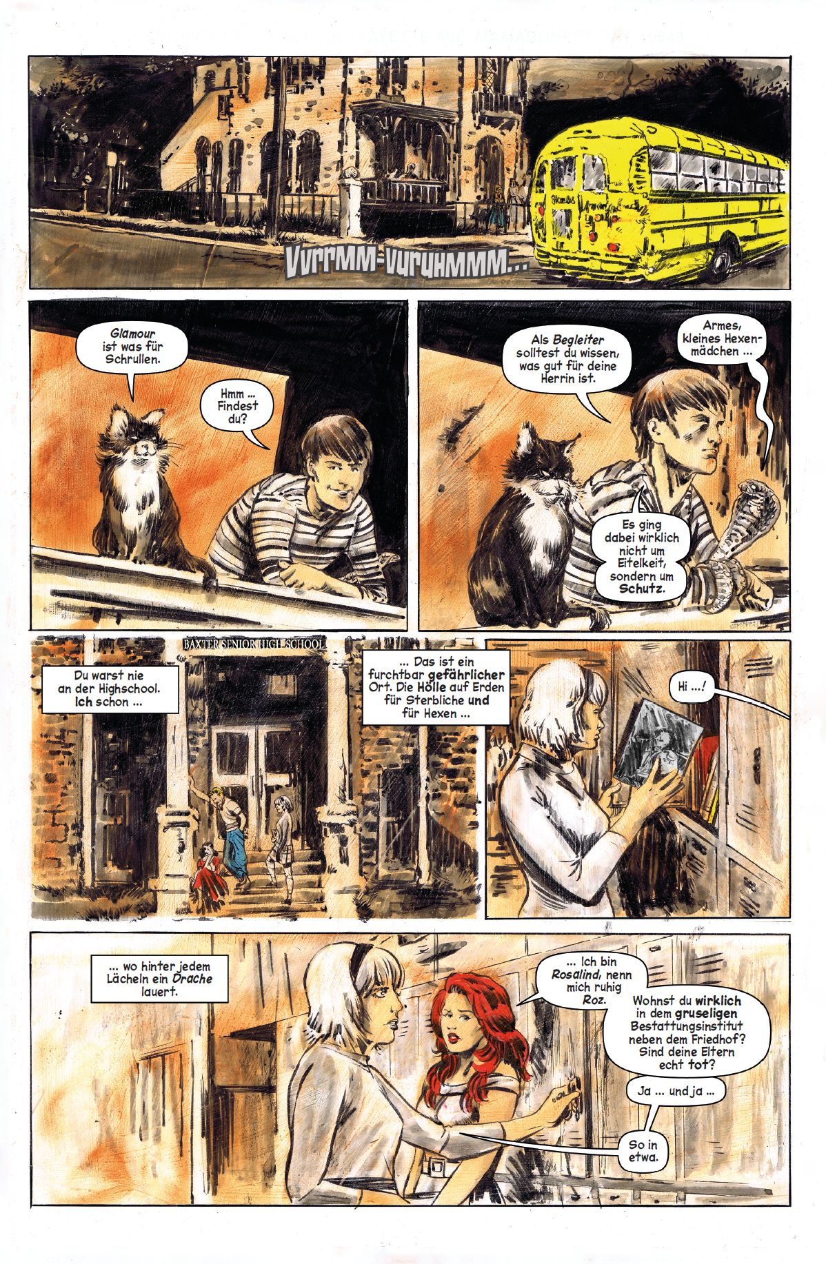 VORWORT VON ROBERTO AGUIRRE-SACASA Es kommt mir einmal mehr wie ein verrückter Traum vor, dass es den Band, den ihr in der Hand haltet, überhaupt gibt. Nach dem Überraschungserfolg Afterlife with Archie schlug ich Jon Goldwater, dem Geschäftsführer und Herausgeber von Archie Comics (mit dem ich mittlerweile gut befreundet bin), eine begleitende Horrorserie über die Teenager-Hexe Sabrina Spellman vor. „Afterlife sehe ich als meine Hommage an Alan Moores: Swamp Thing“, sagte ich. „Sabrina wäre dann so etwas wie meine Sandman-Hommage.“ Jon war sofort überzeugt. Afterlife drehte sich um Lovecraft und Zombies und Bodyhorror, aber für Sabrina schwebte mir etwas Psychologischeres, etwas Subtileres – die Betonung liegt auf etwas – und etwas Sexuelleres, was generell zu Geschichten über Hexen passt, vor. Es sollte weniger Humor geben als in Afterlife, wo ich mich an Sam Raimi orientierte. Nun dachte ich eher an Rosemary’s Baby und Der Exorzist und Arthur Millers: Hexenjagd, weswegen dieser Band auch diesen Untertitel bekommen hat. Es ist eine dunkle, okkulte Geschichte über das Erwachsenwerden. Um den Band noch stärker von Afterlife zu trennen (dort tritt Sabrina in einer kleinen Rolle auf), sollte Chilling Adventures of Sabrina – der Titel bezieht sich auf die alte Archie-Horroranthologie Chilling Adventures of Sorcery – in den 1960ern spielen. Ungefähr zu dieser Zeit kamen nicht nur die ersten tollen Satan-Filme heraus, sondern auch die ersten Sabrina-Geschichten. An diesem Punkt fehlte nur noch ein Teil in diesem Puzzle und wir waren fast fertig. Wir mussten nur noch einen Zeichner für Sabrina finden, der so gut wie Francesco Francaville war, der Afterlife with Archie gezeichnet hat. Sollte kein Problem sein … Robert Hack hatte ein Variant-Cover für den ersten Afterlife-Band gezeichnet. Und einige nach Retro aussehende Variant-Cover für das Archie-Magazin. Ich fragte ihn, ob er je das Innere eines Comics gezeichnet hatte. Das hatte er nicht, aber wir riskierten es trotzdem. Anfangs sollte Robert Sabrina nur zeichnen und tuschen, aber nicht kolorieren. Wir kontaktierten mehrere wunderbare Farbkünstler, aber sie passten nicht so recht zum Stil. Kurzzeitig spielten wir sogar mit dem Gedanken, den Band in Schwarzweiß herauszubringen. Dann kehrte ich zu Robert zurück und fragte ihn, ob er je seine eigenen Arbeiten koloriert hätte. „Ja“, sagte er, „aber nur Einzelbilder. Nichts in diesem Ausmaß.“ Auch dieses Risiko gingen wir ein. Francesco kümmert sich komplett um das Artwork in Afterlife und Robert Hack macht das nun bei Chilling Adventures auch. Beide Reihen haben einen ganz eigenen Stil, aber meiner bescheidenen Meinung nach gibt es momentan nichts auf dem Markt, was besser aussieht. Was noch? Ach ja, wir lieben diese Reihe. Sie ist nicht einfach zu machen … Was ist schon einfach? … aber wir wollen, dass sie weiter und weiter und weiter läuft. Gepriesen sei Sabrina Spellman, Königin der Kirche der Nacht!