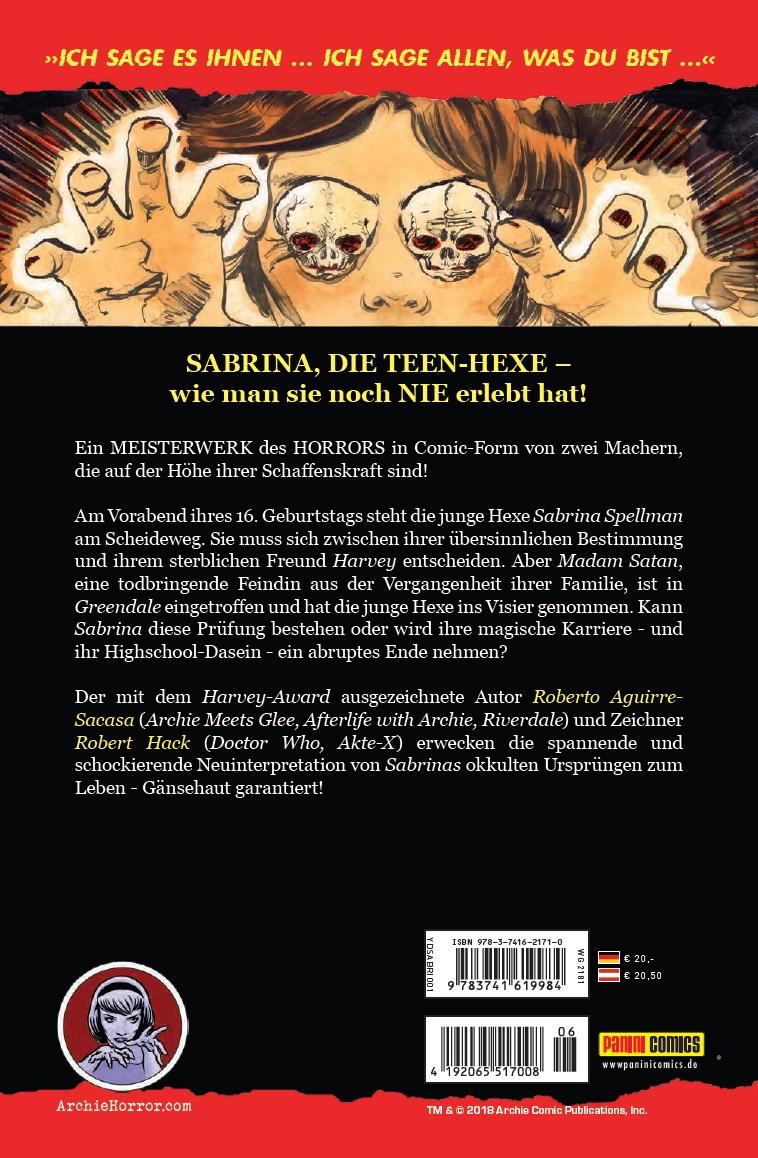 »ICH SAGE ES IHNEN ... ICH SAGE ALLEN, WAS DU BIST ...«SABRINA, DIE TEEN-HEXE - wie man sie noch NIE erlebt hat!Ein MEISTERWERK des HORRORS in Comic-Form von zwei Machern, die auf der Höhe ihrer Schaffenskraft sind!Am Vorabend ihres 16. Geburtstags steht die junge Hexe Sabrina Spellman am Scheideweg. Sie muss sich zwischen ihrer übersinnlichen Bestimmung und ihrem sterblichen Freund Harvey entscheiden. Aber Madam Satan, eine todbringende Feindin aus der Vergangenheit ihrer Familie, ist in Greendale eingetroffen und hat die junge Hexe ins Visier genommen. Kann Sabrina diese Prüfung bestehen oder wird ihre magische Karriere - und ihr Highschool-Dasein - ein abruptes Ende nehmen?Der mit dem Harvey-Award ausgezeichnete Autor Roberto Aguirre-Sacasa (Archie Meets Glee, Afterlife with Archie, Riverdale) und Zeichner Robert Hack (Doctor Who, Akte-X) erwecken die spannende und schockierende Neuinterpretation von Sabrinas okkulten Ursprüngen zum Leben - Gänsehaut garantiert!