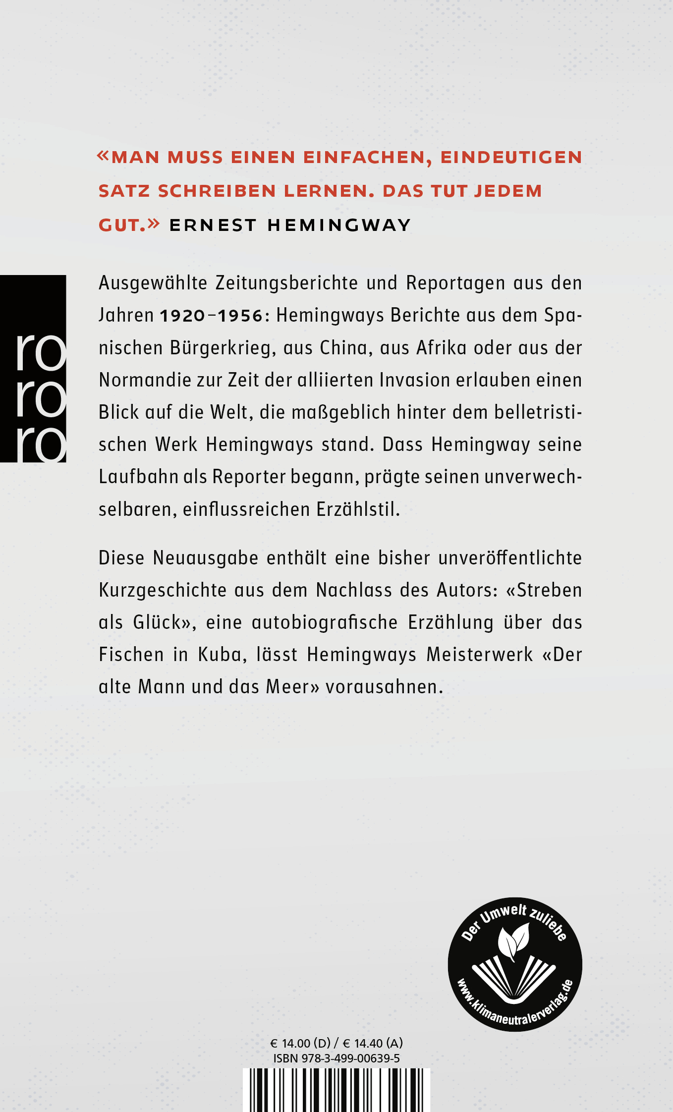 Diese Neuausgabe enthält eine bis dato unveröffentlichte Kurzgeschichte, die in klarem Bezug zu seiner Reportage «Der Marlin» steht und auch sein Meisterwerk «Der alte Mann und das Meer» vorausahnen lässt.