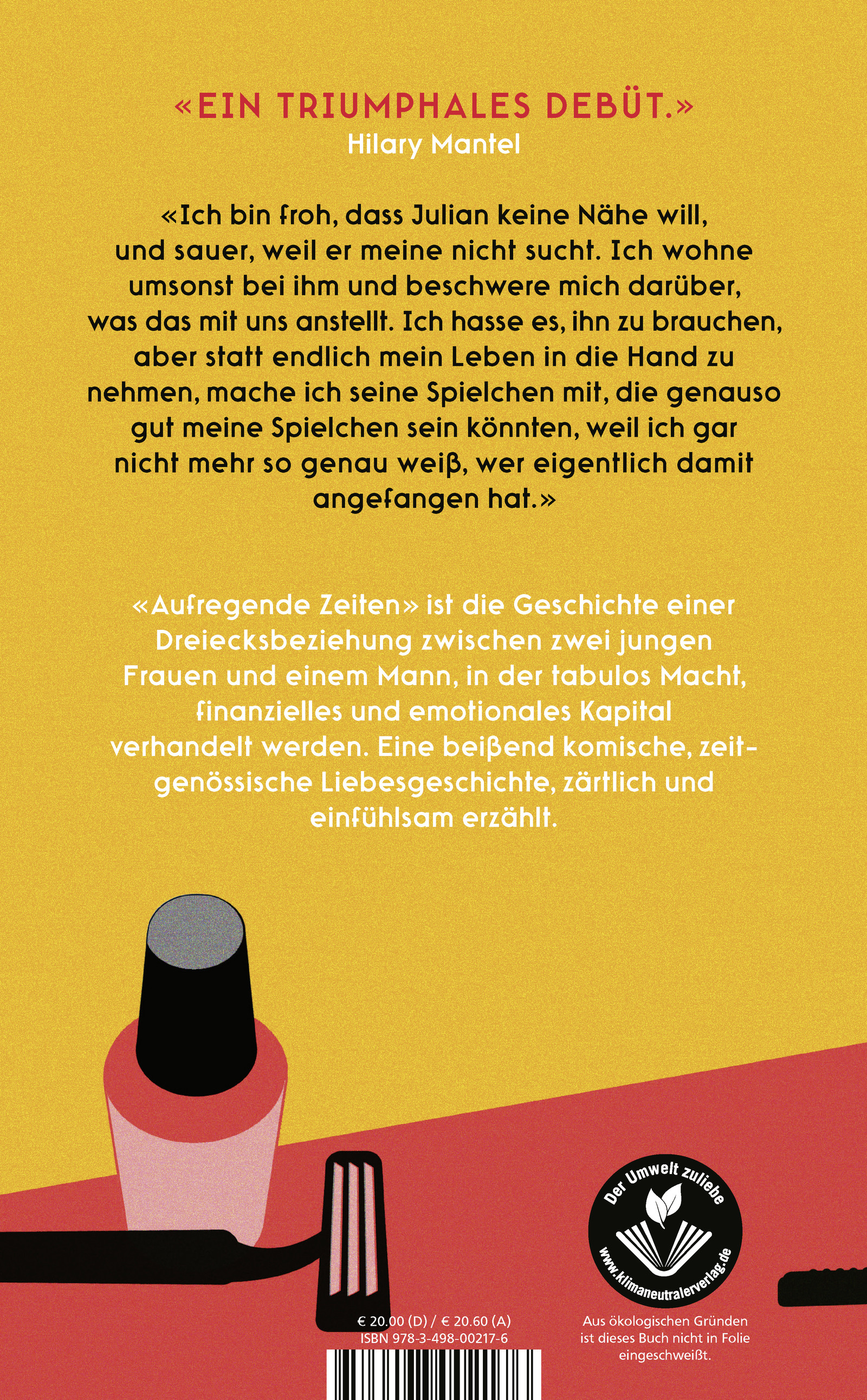 «Aufregende Zeiten» spielt im Hongkong der Gegenwart und erzählt die Geschichte einer Dreiecksbeziehung zwischen zwei jungen Frauen und einem Mann. Eine beißend komische zeitgenössische Beziehungsgeschichte, zärtlich und einfühlsam erzählt. «Aufregende Zeiten» ist der wilde, intelligente Debütroman einer dezidiert politischen Autorin, die über Beziehungsdynamiken, Machtfragen, finanzielles und emotionales Kapital nachdenkt, ohne sich dabei irgendwelchen Tabus zu unterwerfen. Das Debüt einer jungen Stimme, die laut, deutlich und sehr besonders ist.