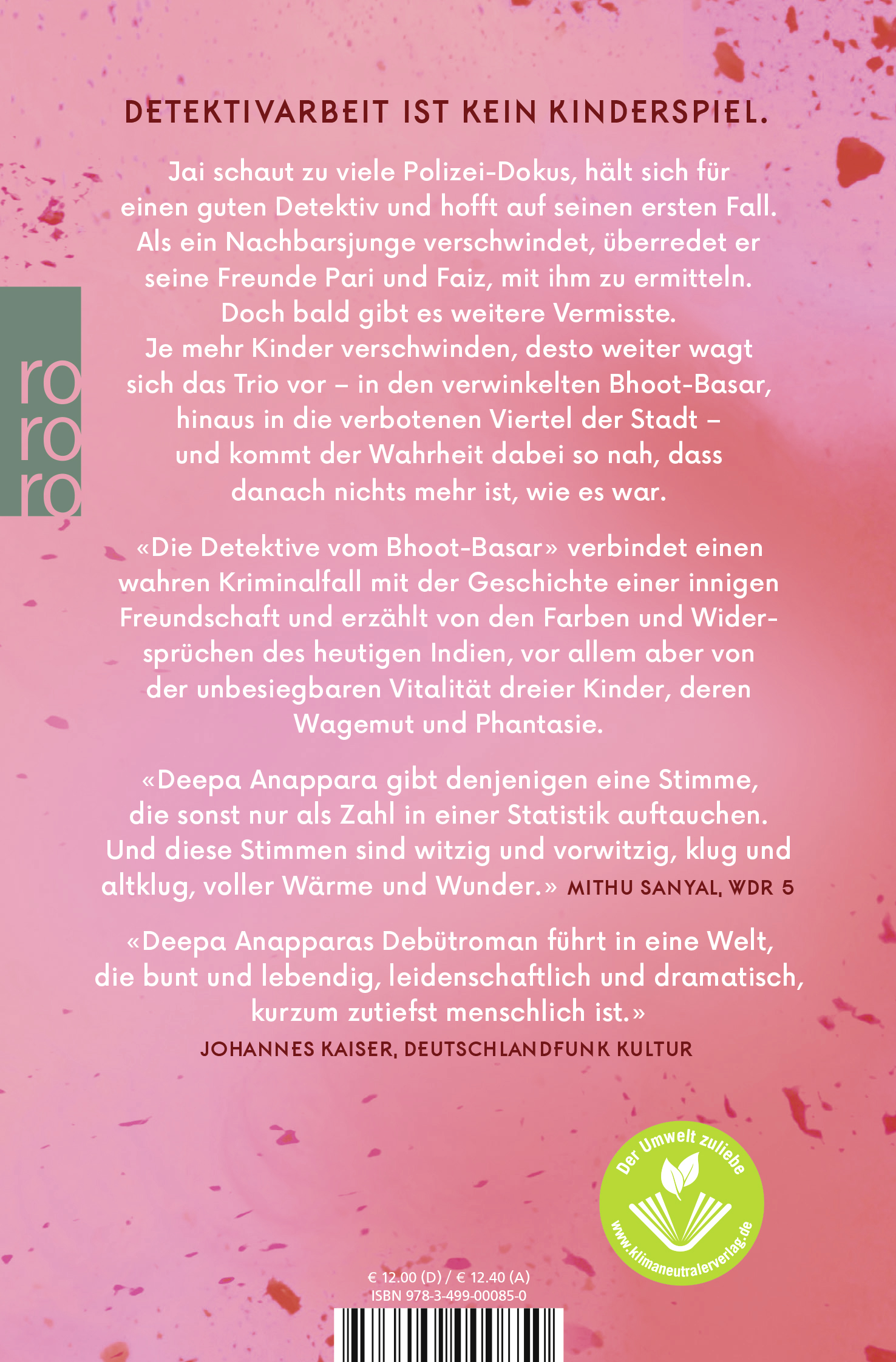 Deepa Anapparas Debütroman „Die Detektive vom Bhoot-Basar“ ist in jeder Hinsicht ungewöhnlich. Es gelingt ihr, eine packende Thriller-Story um einen verschwundenen Jungen, um Kidnapping und Menschenhandel, einzubetten in eine Geschichte, die vom Erwachsenwerden erzählt und zugleich als Sozialdrama funktioniert. Das tut sie mit viel Humor ... Ein packender Debütroman. (Hamburger Abendblatt, 16.03.2020)