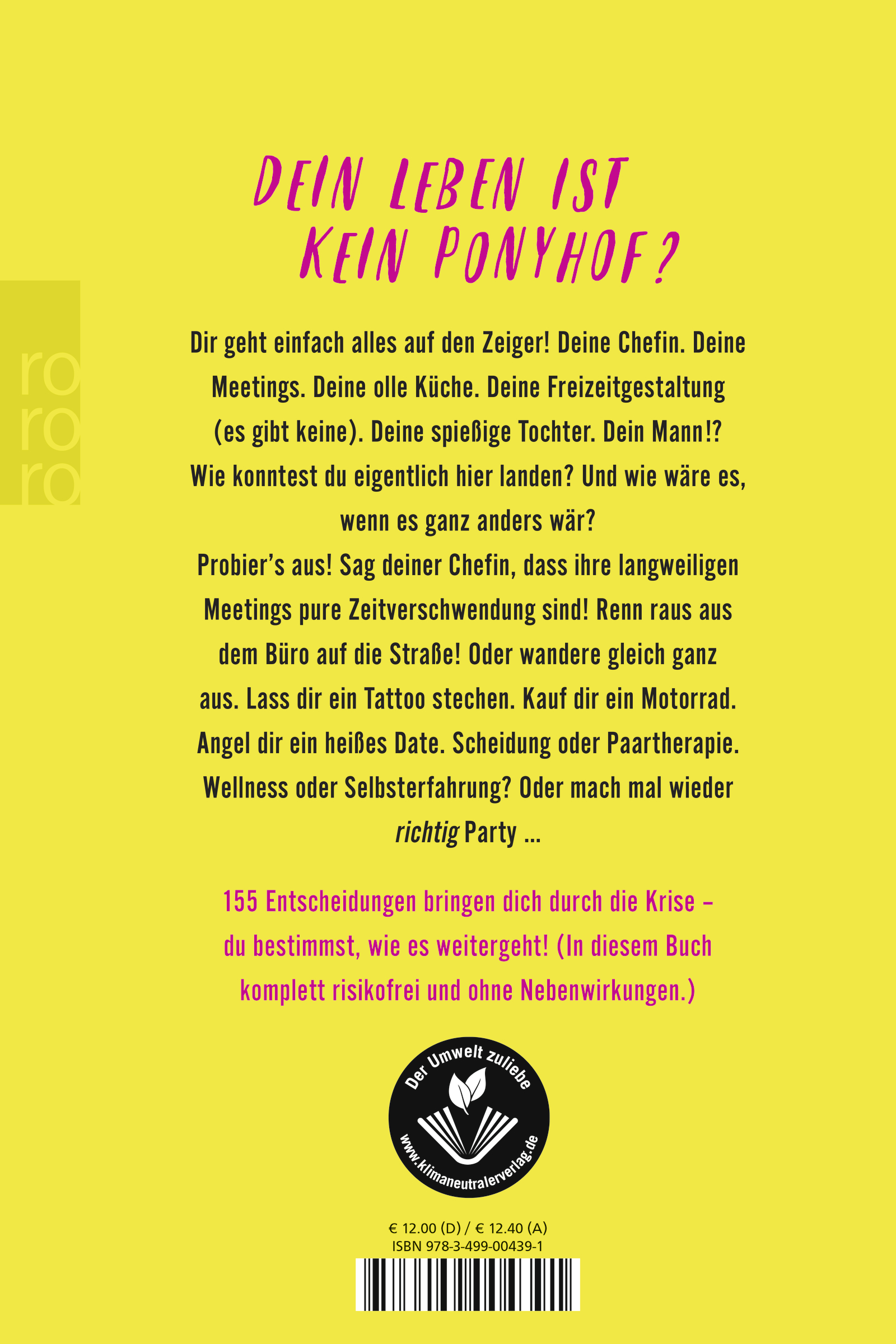 Probier's aus! Sag deiner Chefin, dass ihre langweiligen Meetings pure Zeitverschwendung sind! Renn raus aus dem Büro auf die Straße! Oder wandere gleich ganz aus. Lass dir ein Tattoo stechen. Kauf dir ein Motorrad. Angel dir ein heißes Date. Scheidung oder Paartherapie. Wellness oder Selbsterfahrung? Oder mach mal wieder ((KURSIV))richtig((KURSIV ENDE)) Party ...