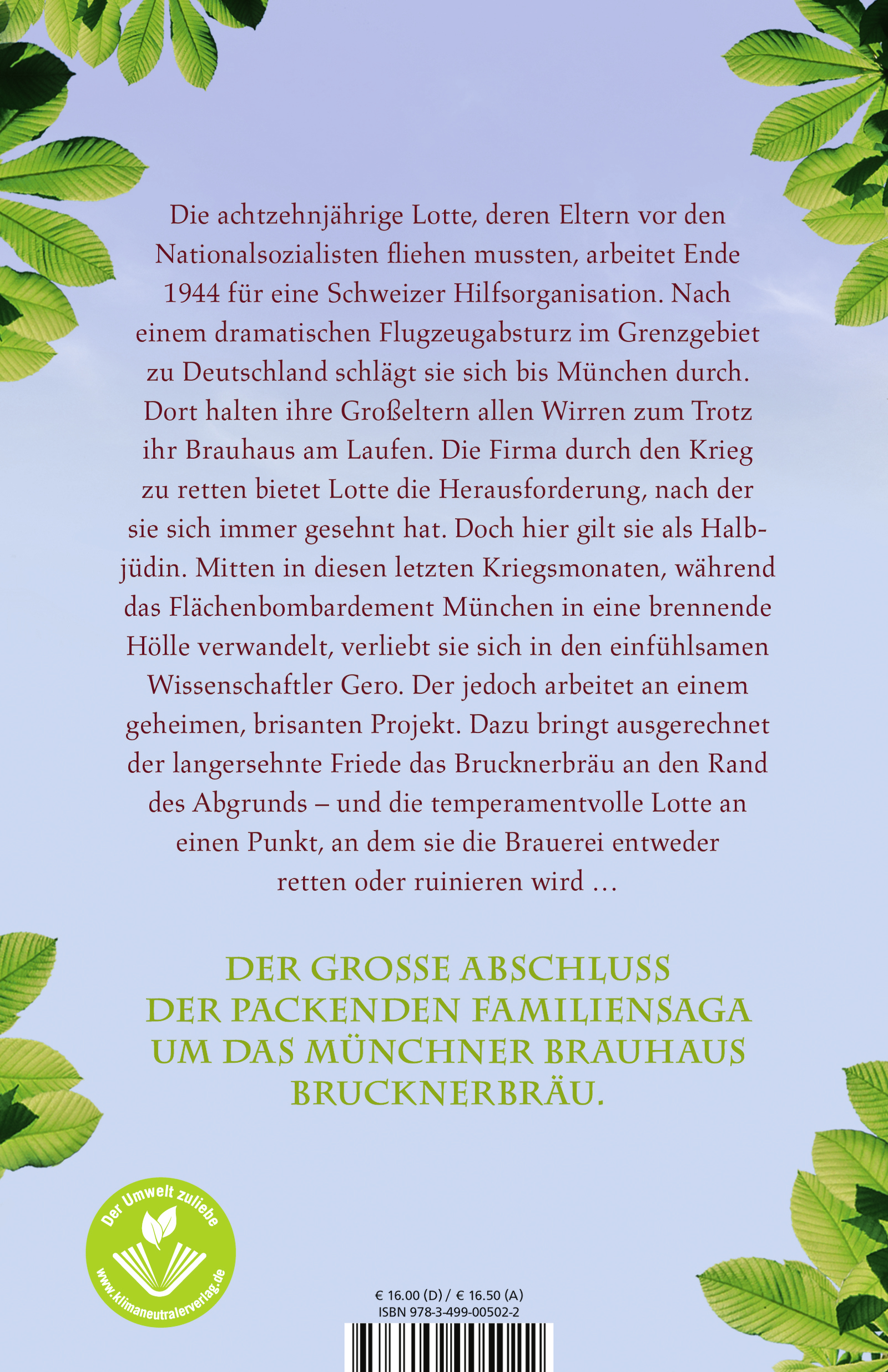 Die achtzehnjährige Lotte, deren Eltern vor den Nationalsozialisten fliehen mussten, arbeitet Ende 1944 für eine Schweizer Hilfsorganisation. Nach einem dramatischen Flugzeugabsturz im Grenzgebiet zu Deutschland schlägt sie sich bis München durch. Dort halten ihre Großeltern allen Wirren zum Trotz ihr Brauhaus am Laufen. Die Firma durch den Krieg zu retten bietet Lotte die Herausforderung, nach der sie sich immer gesehnt hat. Doch hier gilt sie als Halbjüdin. Mitten in diesen letzten Kriegsmonaten, während das Flächenbombardement München in eine brennende Hölle verwandelt, verliebt sie sich in den einfühlsamen Wissenschaftler Gero. Doch er arbeitet an einem geheimen, brisanten Projekt. Dazu bringt ausgerechnet der langersehnte Friede das Brucknerbräu an den Rand des Abgrunds - und die temperamentvolle Lotte an einen Punkt, an dem sie die Brauerei entweder retten oder ruinieren wird ...