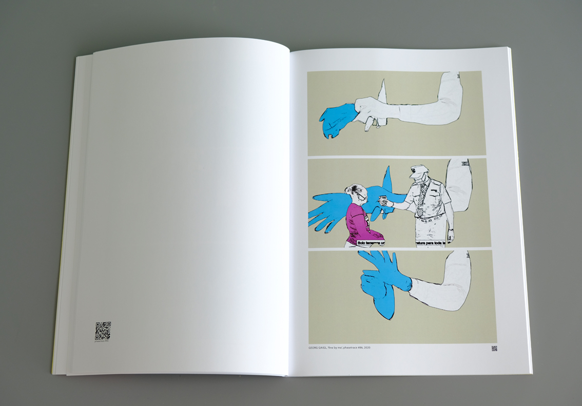 Auf Instagram zeigt Georg Gaigl in 12 Bildern in zwei Sekunden seine „two-second-flicks“ im neuen Format von minimalistischen Filmskizzen. Die handelnden Figuren sind freigestellt vor einem monochromen Hintergrund. Die Titel sind oft verfremdete Zitate wie zum Beispiel saying alive und werden auf der begleitenden Tonspur eingesprochen sowie manchmal auch im Film grafisch wiedergegeben. Die Sujets bestehen aus mehr oder weniger deutlich erkennbaren Bezügen zu aktuellen Themen der gegenwärtigen Medienlandschaft. Bei phasetrace – was formal auch eine Reminiszenz zu Georg Gaigls Zeit als Videojockey darstellt – orientiert er sich an die Bildfolgen von Eadweard Muybridge, der mit seiner Chronofotografie die Bewegungen eines galoppierenden Pferds im Bild festhielt, um sichtbar zu machen, was außerhalb der menschlichen Wahrnehmungsfähigkeit liegt. Aber vermutlich sind die flicks dem von Muybridge später entwickelten Zoopraxiskop noch ähnlicher, mit dem er die einzelnen Aufnahmen auf einer Leinwand als Bewegungsverlauf darstellte. Aber egal von welcher Seite man sich den kurzen Sequenzen annähert: man hat es hier mit einer filmischen Form des Auslassens zu tun, die Lücke wird zum Prinzip. Auf seiner Website fügt Gaigl den Untertitel „communicating the future“ hinzu. Das provoziert die Vorstellung, dass, wenn in ferner Zukunft diese Dateien ‚gelesen‘ werden, aus diesen bewusst lückenhaften Bild-Informationen variable, instabile Konstruktionen über unseren Alltag möglich sind. Vergleichbar zum großen Vorbild aller Memoria-Kunst, dem Mnemosyne Atlas des Kunsthistorikers Aby Warburg, sind diese Kürzest-Filme Teil eines kulturellen Gedächtnisses, die in einem Mix aus Bild und Ton jede Festschreibung verunmöglichen: sie sind ein spielerischer Umgang mit Auslassungen, Ähnlichkeiten und Differenzen. Mit dem kollektiven Bewusstsein und vor allem mit dem kulturellen Gedächtnis beschäftigt sich auch der portugiesische Künstler Julião Sarmento. Seine bewusst fragmentarisch gestalteten Zeichnungen sind in einer Ästhetik gehalten, die man mit den Figuren in phasetrace vergleichen kann – zum Teil gibt es nur Umrisse von Personen ohne Gesichter, die gleichzeitig verschwinden und wieder erscheinen – und wie bei Gaigl könnte es sich manchmal um ein Fragment aus einem film noir handeln. Beide – Sarmento und Gaigl – benutzen visuelle Quellen, die sich aus einer persönlichen Ikonographie sowie aus einem gemeinsamen kulturellen Gedächtnis speisen. Der neutrale monochrome Bildhintergrund der flicks wirkt wie ein Palimpsest des Ungesagten, der Abwesenheit. Georg Gaigl benutzt – nach Umberto Eco – das ‚offene Kunstwerk‘ als Drehbuch, das fordert Interpretationen und erlaubt Ambiguitäten. Das Kunstwerk ist nur ein Echo, ein Detail. Wie viele spielerisch anmutende Werke verbinden die flicks eine gewisse Attitude der Lässigkeit mit engagierter Gedankentiefe. Die Bedeutung liegt hinter einer Bilddatei.