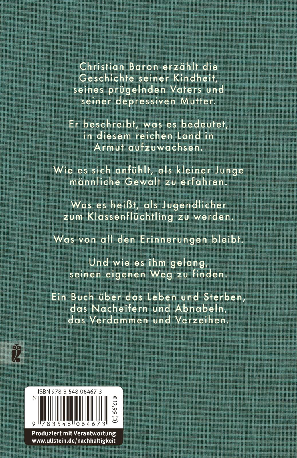 Kaiserslautern in den neunziger Jahren: Christian Baron erzählt die Geschichte seiner Kindheit, seines prügelnden Vaters und seiner depressiven Mutter. Er beschreibt, was es bedeutet, in diesem reichen Land in Armut aufzuwachsen. Wie es sich anfühlt, als kleiner Junge männliche Gewalt zu erfahren. Was es heißt, als Jugendlicher zum Klassenflüchtling zu werden. Was von all den Erinnerungen bleibt. Und wie es ihm gelang, seinen eigenen Weg zu finden.