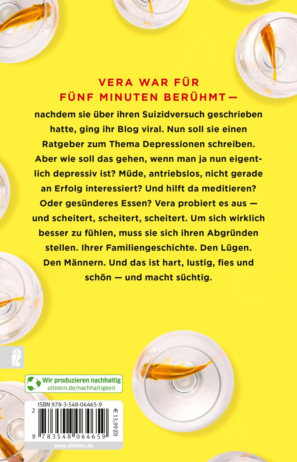 Vera war für fünf Minuten berühmt. Nachdem sie versucht hatte, sich umzubringen, ging ihr Blog viral. Nun soll sie einen Ratgeber zum Umgang mit Depressionen schreiben. Ihre Freundin Pony hat Zweifel, dass sie das schaffen wird. Sie selbst auch. Denn wie soll das gehen, wenn man ja nun eigentlich depressiv ist? Müde, antriebslos, nicht gerade an Erfolg interessiert? Wenn man geheiratet hat, unglücklich ist, aber nicht geschieden? Wenn man seine Oma vermisst, aber nicht weiß, ob sie noch lebt? Und hilft da meditieren? Oder gesünderes Essen?