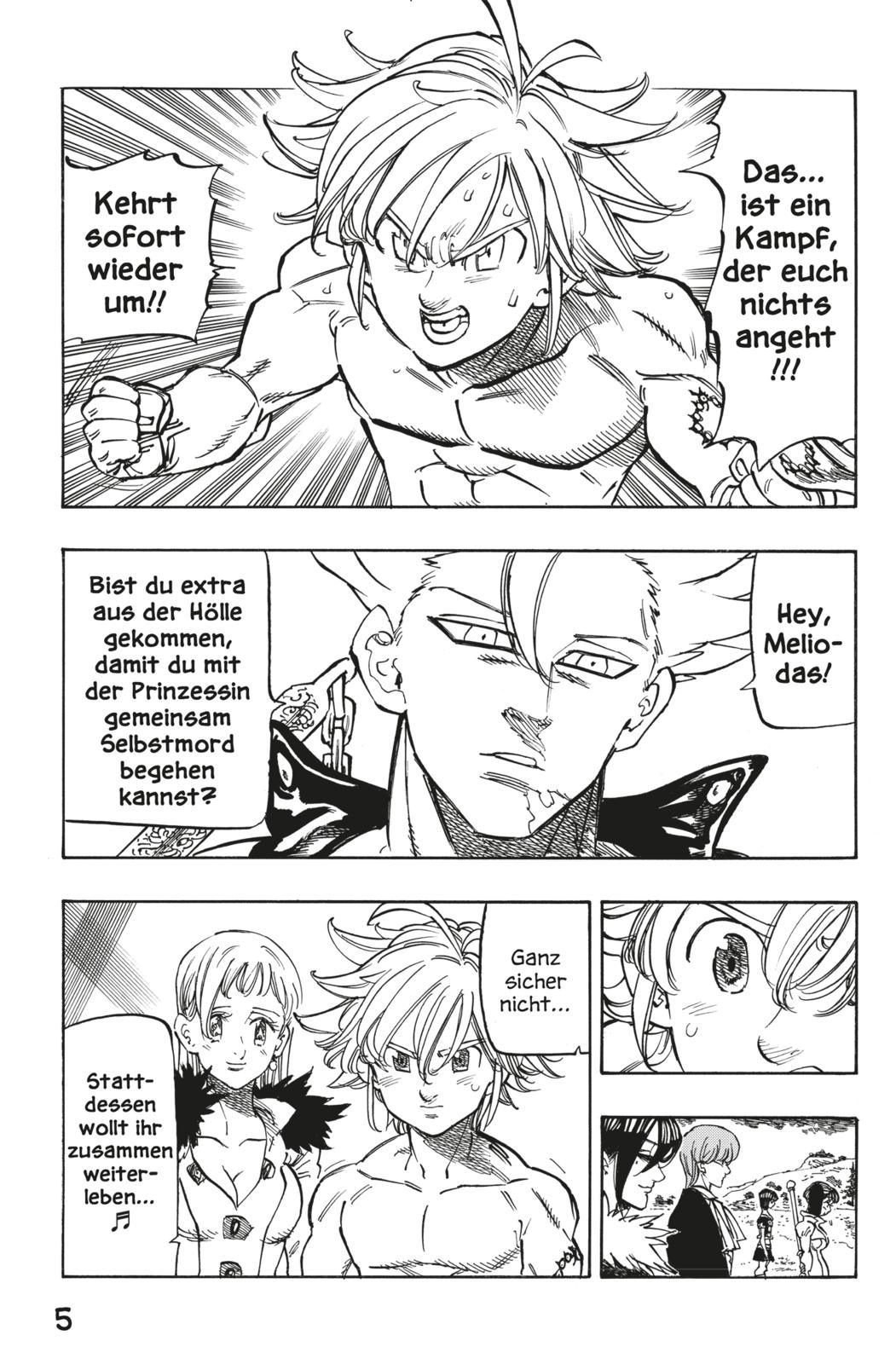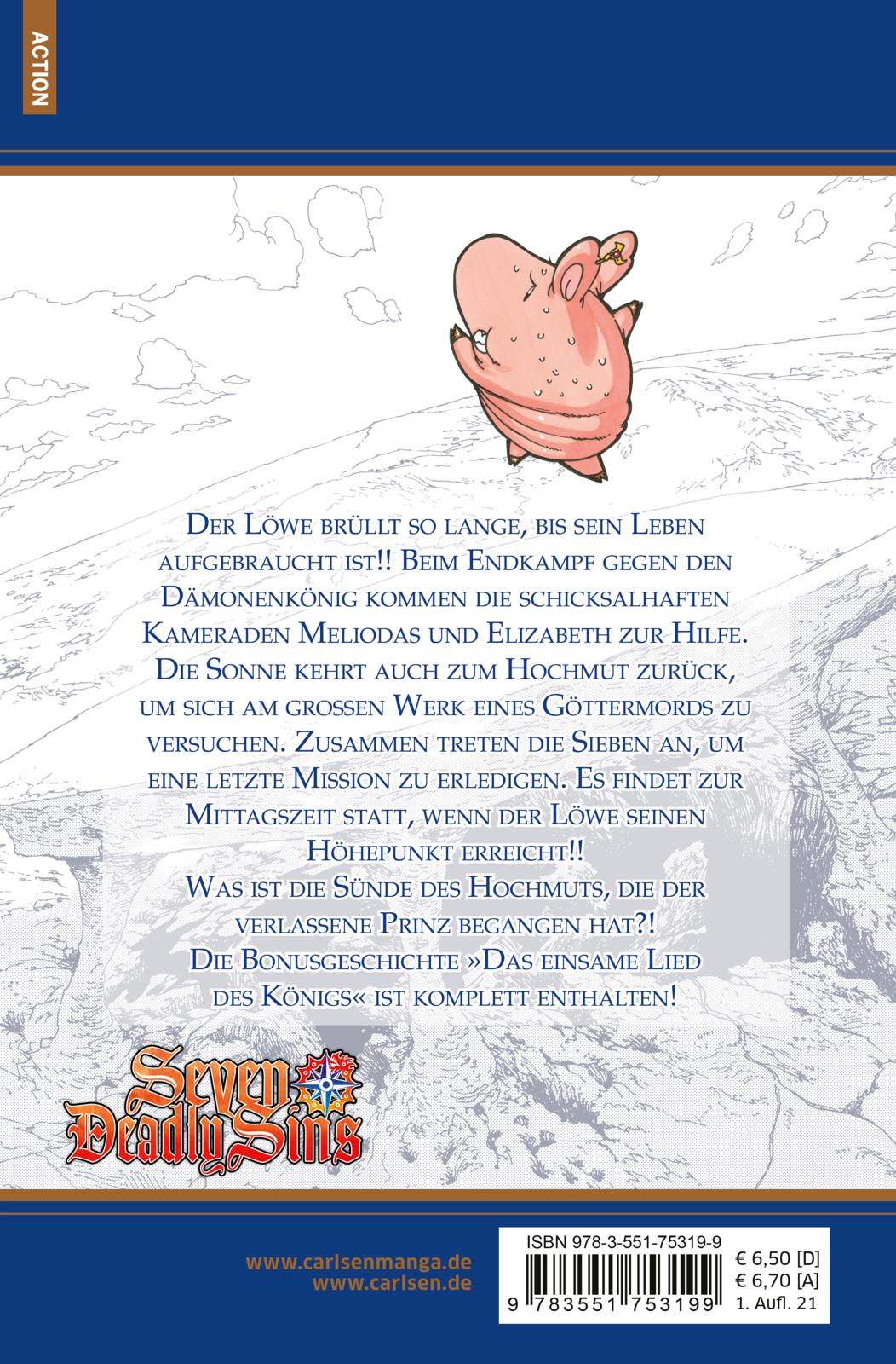 Der Löwe brüllt so lange, bis sein Leben aufgebraucht ist!! Beim Endkampf gegen den Dämonenkönig kommen die schicksalhaften Kameraden Meliodas und Elizabeth zur Hilfe. Die Sonne kehrt auch zum Hochmut zurück, um sich am großen Werk eines Göttermords zu versuchen. Zusammen treten die Sieben an, um eine letzte Mission zu erledigen. Es findet zur Mittagszeit statt, wenn der Löwe seinen Höhepunkt erreicht!! Was ist die Sünde des Hochmuts, die der verlassene Prinz begangen hat?! Die Bonusgeschichte »Das einsame Lied des Königs« ist komplett enthalten!