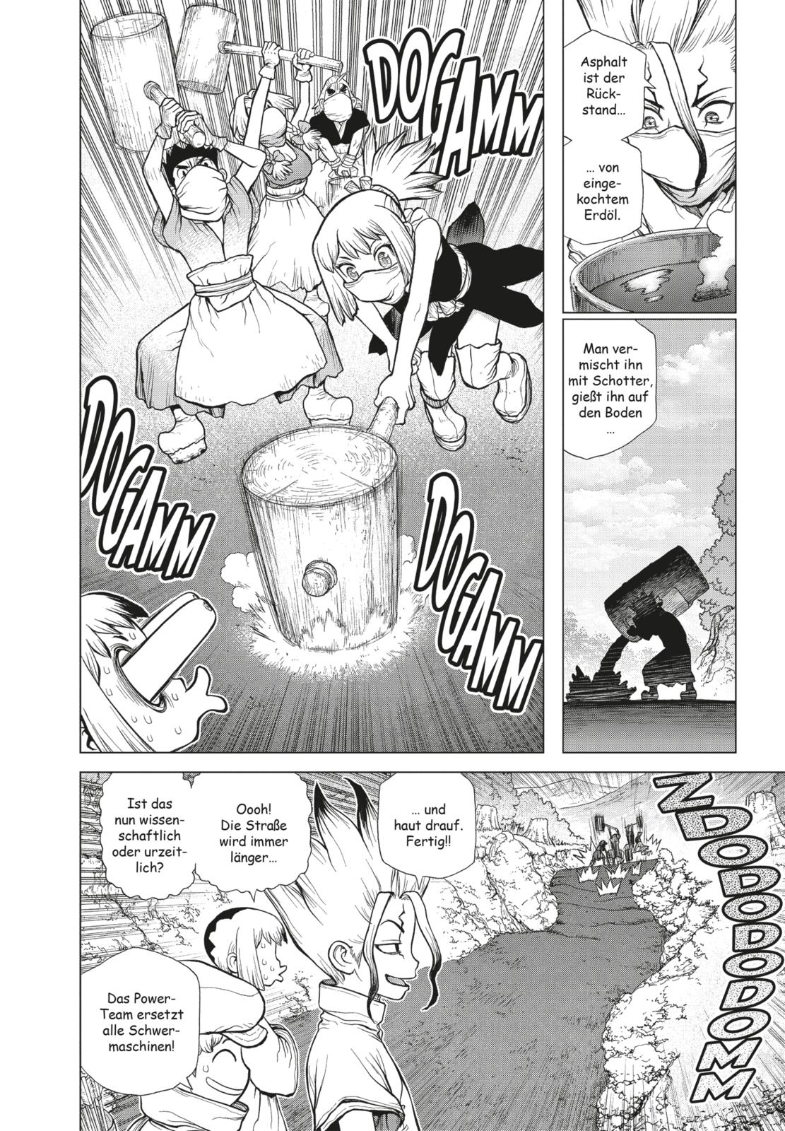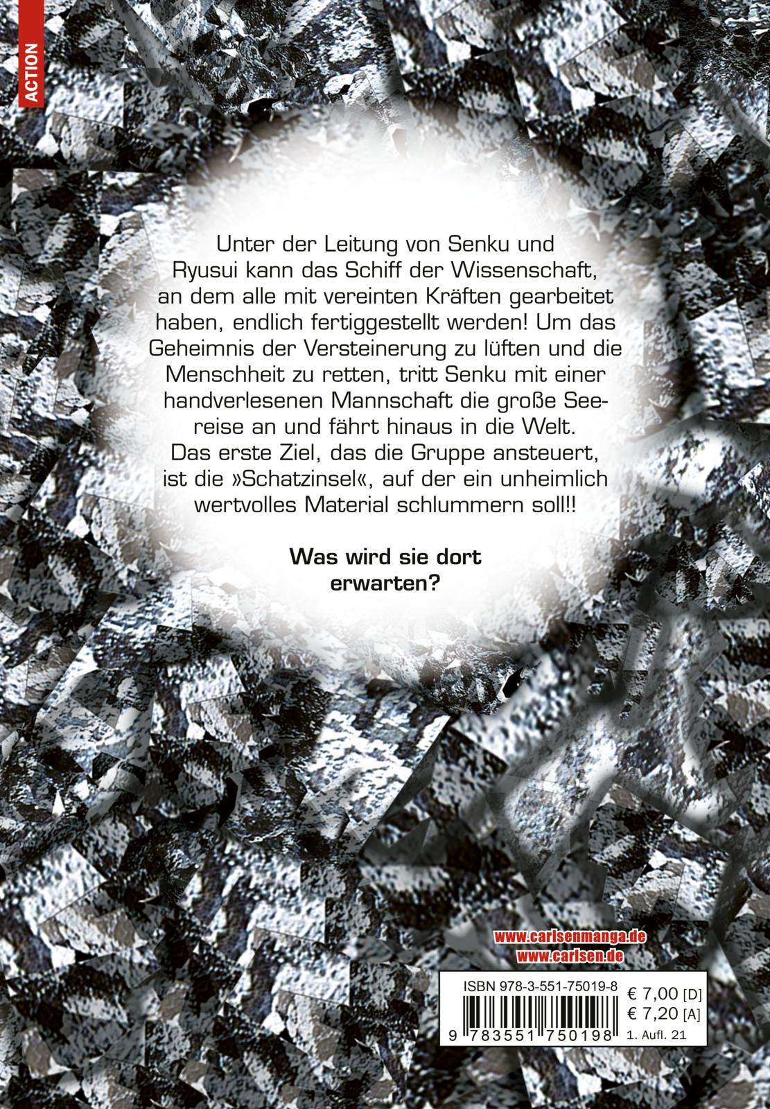 Unter der Leitung von Senku und Ryusui kann das Schiff der Wissenschaft, an dem alle mit vereinten Kräften gearbeitet haben, endlich fertiggestellt werden! Um das Geheimnis der Versteinerung zu lüften und die Menschheit zu retten, tritt Senku mit einer handverlesenen Mannschaft die große Seereise an und fährt hinaus in die Welt. Das erste Ziel, das die Gruppe ansteuert, ist die »Schatzinsel«, auf der ein unheimlich wertvolles Material schlummern soll!!