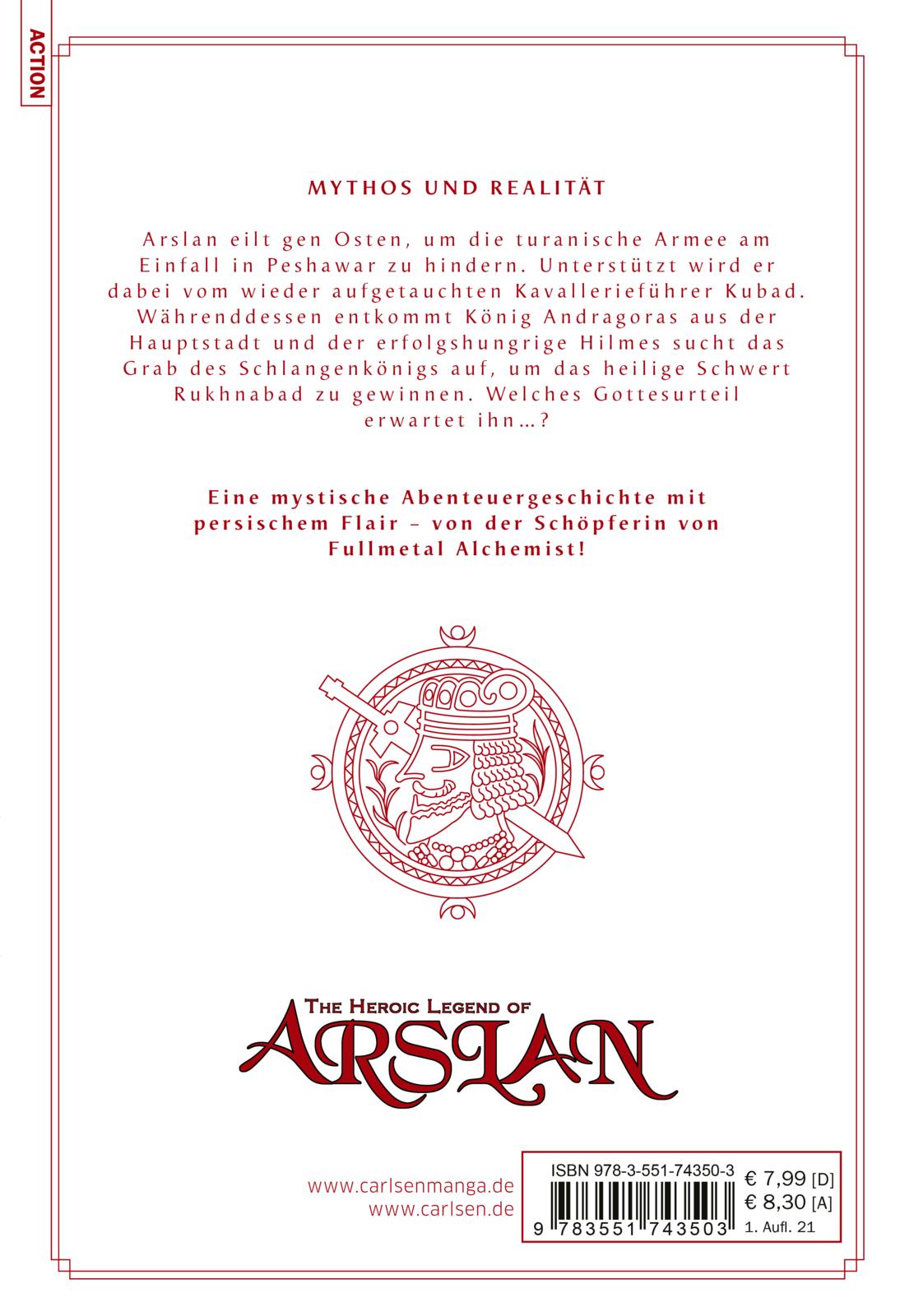 Arslan eilt gen Osten, um die turanische Armee am Einfall in Peshawar zu hindern. Unterstützt wird er dabei vom wiederaufgetauchten Kavallerieführer Kubad. Wahrenddessen entkommt König Arndragoras aus der Hauptstadt und der erfolgshungrige Hilmes sucht das Grab des Schlangenkönigs auf, um das heilige Schwert Rukhnabad zu gewinnen. Welches Gottesurteil erwartet ihn?