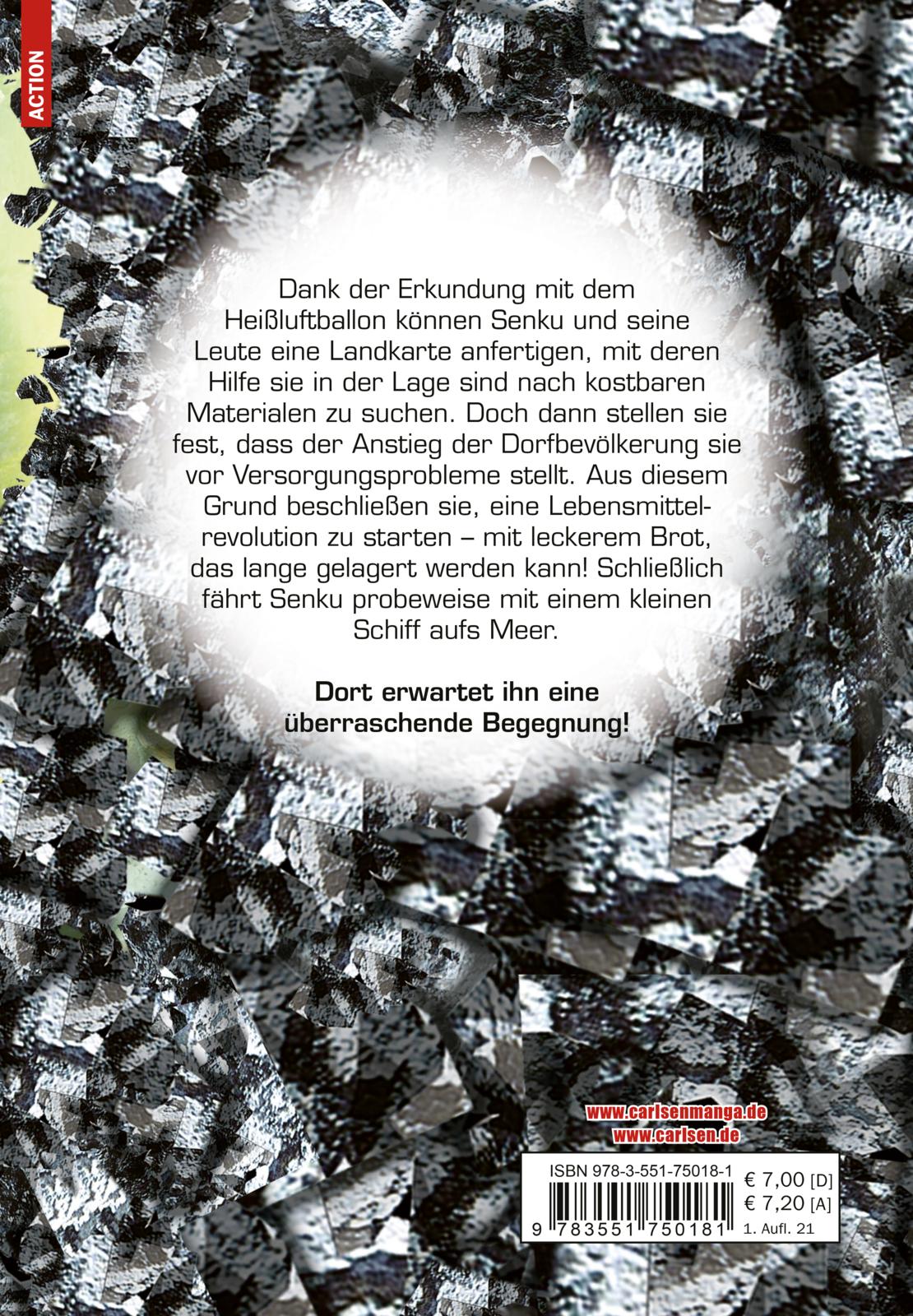 Dank der Erkundung mit dem Heißluftballon können Senku und seine Leute eine Landkarte anfertigen, mit deren Hilfe sie nach kostbaren Materialen suchen können. Doch dann stellen sie fest, dass der Anstieg der Dorfbevölkerung sie vor Versorgungsprobleme stellt. Aus diesem Grund beschließen sie, eine Lebensmittelrevolution zu starten - mit leckerem Brot, das lange gelagert werden kann! Als Senku schließlich probeweise mit einem kleinen Schiff aufs Meer fährt, erwartet ihn eine überraschende Begegnung!