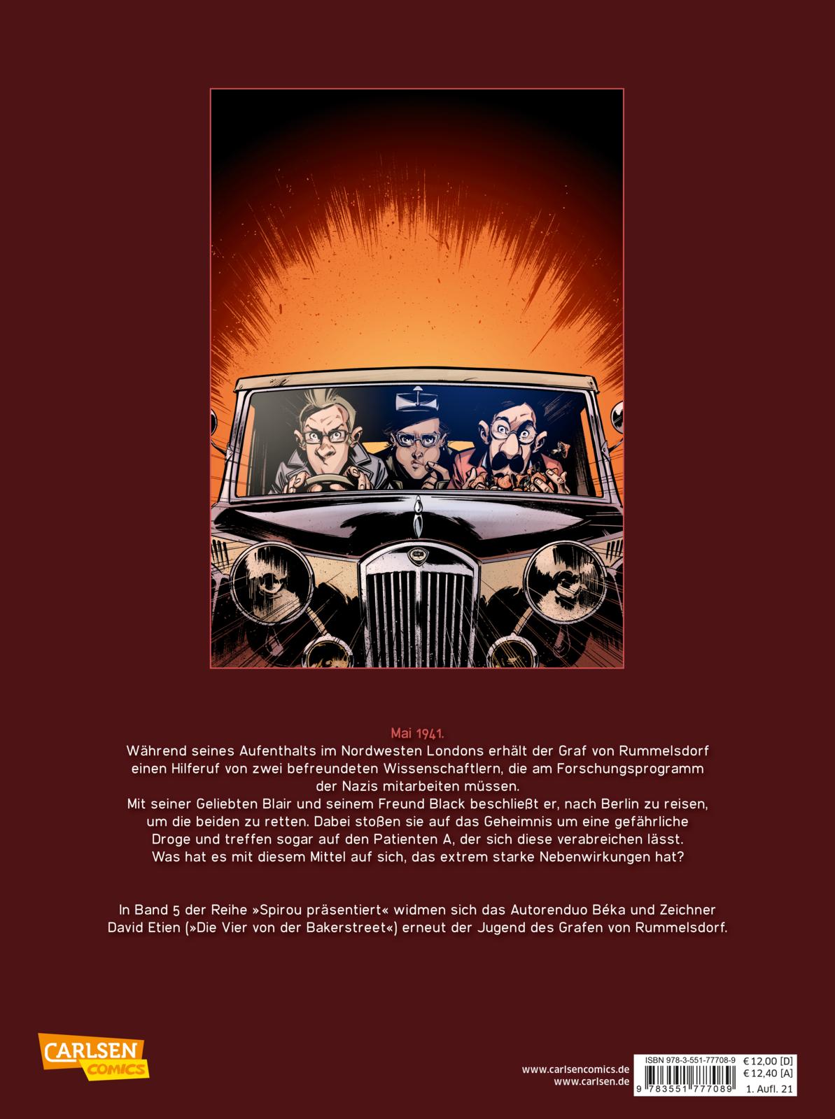 In dieser Reihe erzählen verschiedene Künstler*innen die Abenteuer von Freunden und Feinden von Spirou und Fantasio. In Band 5 der Reihe widmen sich das Autorenduo Béka und Zeichner David Etien (Die Vier von der Bakerstreet) nach Band 4 »Enigma« erneut der Jugend des Grafen von Rummelsdorf.