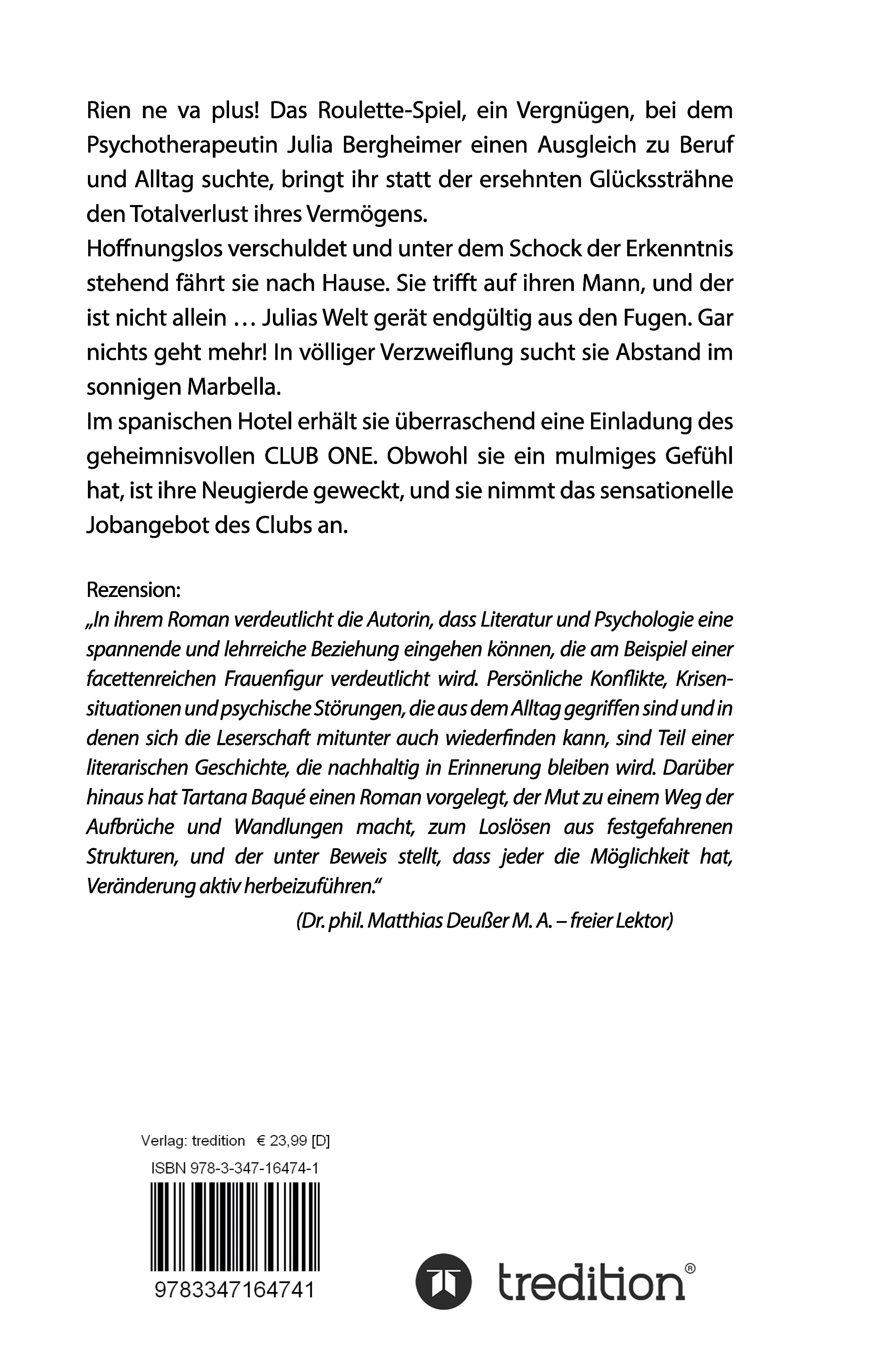 | Schlagworte | Club One • ClubOne • Erotik • Geheim • Glückssträhne • Golfclub • Hoffnung • Köln • Leidenschaft • Liebe • Marbella • Marienbuch • Psychologie • Roulette • Schicksal • Spiel • Sucht • Therapie • Verzweiflung • Villa |
