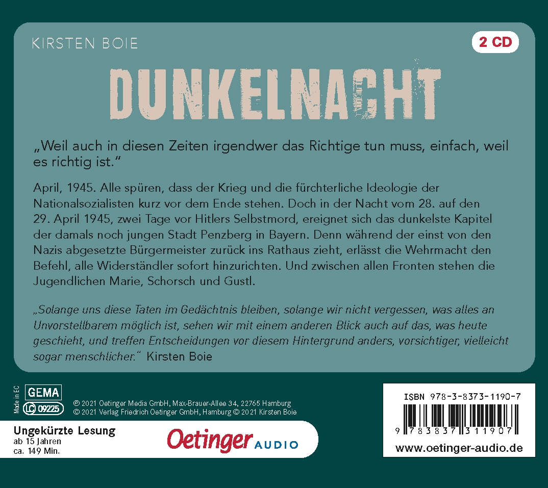 Nach einer wahren Begebenheit: In der Nacht vom 28. auf den 29. April 1945, der Krieg und das Naziregime stehen kurz vor ihrem Ende, ereignet sich das dunkelste Kapitel der damals noch jungen Stadt Penzberg in Bayern. Die Wehrmacht erteilt den Befehl, alle Widerständler, sechzehn Frauen und Männer, sofort hinzurichten. Kirsten Boie schildert die Hintergründe dieser schrecklichen Mordnacht aus Sicht der Jugendlichen Marie, Schorsch und Gustl.