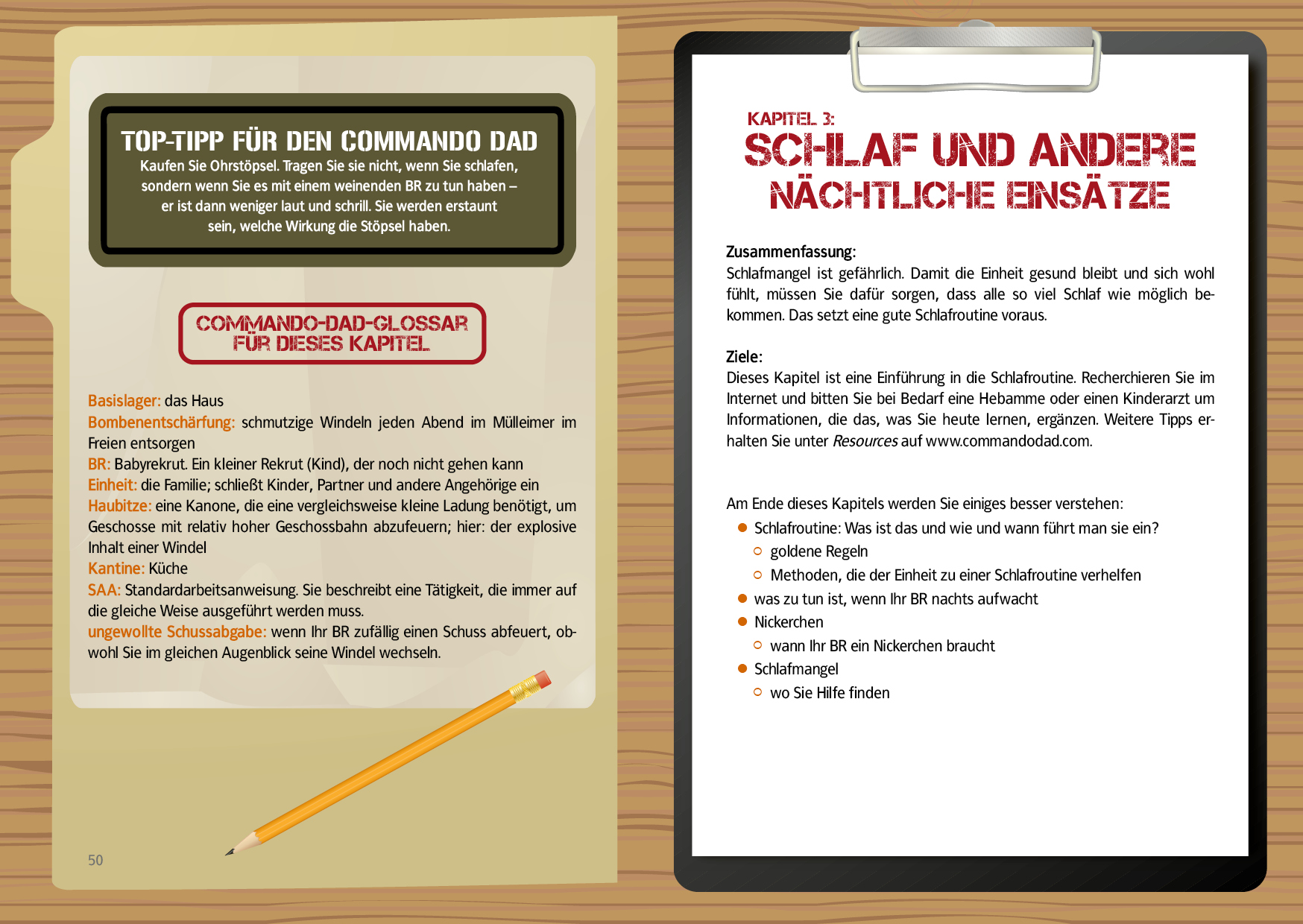 Neil Sinclair, Ex-Soldat und dreifacher Vater, fasst in »Commando Dad« all das zusammen, was Sie in den ersten drei Jahren nach der Geburt Ihres Babyrekruten wissen müssen. Er zeigt unter anderem, wie Sie sich auf die Ankunft des Trupps vorbereiten können, wie Sie die ersten 24 Stunden überleben, die Moral aufrechterhalten und den Trupp verpflegen, verarzten, transportieren und unterhalten. Prägnante Tipps, Informationen und Abbildungen sorgen dafür, dass Sie in der Not auf einen Blick wissen, was zu tun ist. Nach dieser Grundausbildung steht Ihrer Karriere als Super-Dad nichts mehr im Wege!