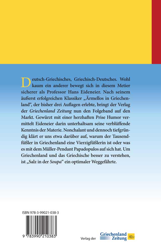 Deutsch-Griechisches, Griechisch-Deutsches. Kaum einer bewegt sich in diesem Metier sicherer als unser Autor Professor Hans Eideneier. Er hat in seinem produktiven Arbeitsleben eine Gemeinde um sich geschart - als Lehrer, als Lehrender an Universitäten, als Wissenschaftler, als gern gesehener Dauergast bei der Griechenland Zeitung und als Buchautor. "Salz in der Soupa" ist die zweite Publikation, die der Verlag der Griechenland Zeitung mit Eideneier nach dem äußerst erfolgreichen Klassiker "Ärmellos in Griechenland" auf den Markt bringt. Es handelt sich bei dieser Ausgabe um einen Folgeband, und deswegen ist er auch hier wieder mit dem Untertitel "Griechisch-Deutsche Sprachfindigkeiten" versehen. In diesem Band sind etwa 100 Texte versammelt. Nonchalant und doch tiefgründig schafft es der Autor, darin seine Themen schmackhaft zu servieren: Soll man hier den Beitrag "Monster Terabyte" nennen oder die "Augengläser aus Belur", in dem man erfährt, was unsere Brille mit einer südindischen Stadt und dem Griechischen zu tun hat. Oder Sprachfindigkeiten wie "Käfftädes und Biffteki" und die "Blätterteigspinatpastete"? Sicher möchten Sie auch wissen, warum ein Tausendfüßler in Griechenland eine Vierzigfüßlerin ist, und Details über das griechische Müller-Pendant Papadopoulos erfahren. Das bunte Bild dieser dutzenden kleinen Farbtupfer komplettieren einige größer angelegte Pinselstriche: Dazu gehört die Dominanz der Musik in der Hörkultur der Griechen ebenso wie die Stellung der neugriechischen Literatur in einem gesamteuropäischen Kontext. Um Griechisch und das Griechische, eingebunden in Kultur und Gesellschaft, und beides in Gegenwart und Vergangenheit, besser zu verstehen, ist "Salz in der Soupa" ohne Zweifel der optimale Weggefährte. Die Karikaturen stammen wie schon bei "Ärmellos" aus der Feder von Kostas Mitropoulos. Generös stellte der Doyen der griechischen Karikaturszene Arbeiten auch für diese Ausgabe zur Verfügung.