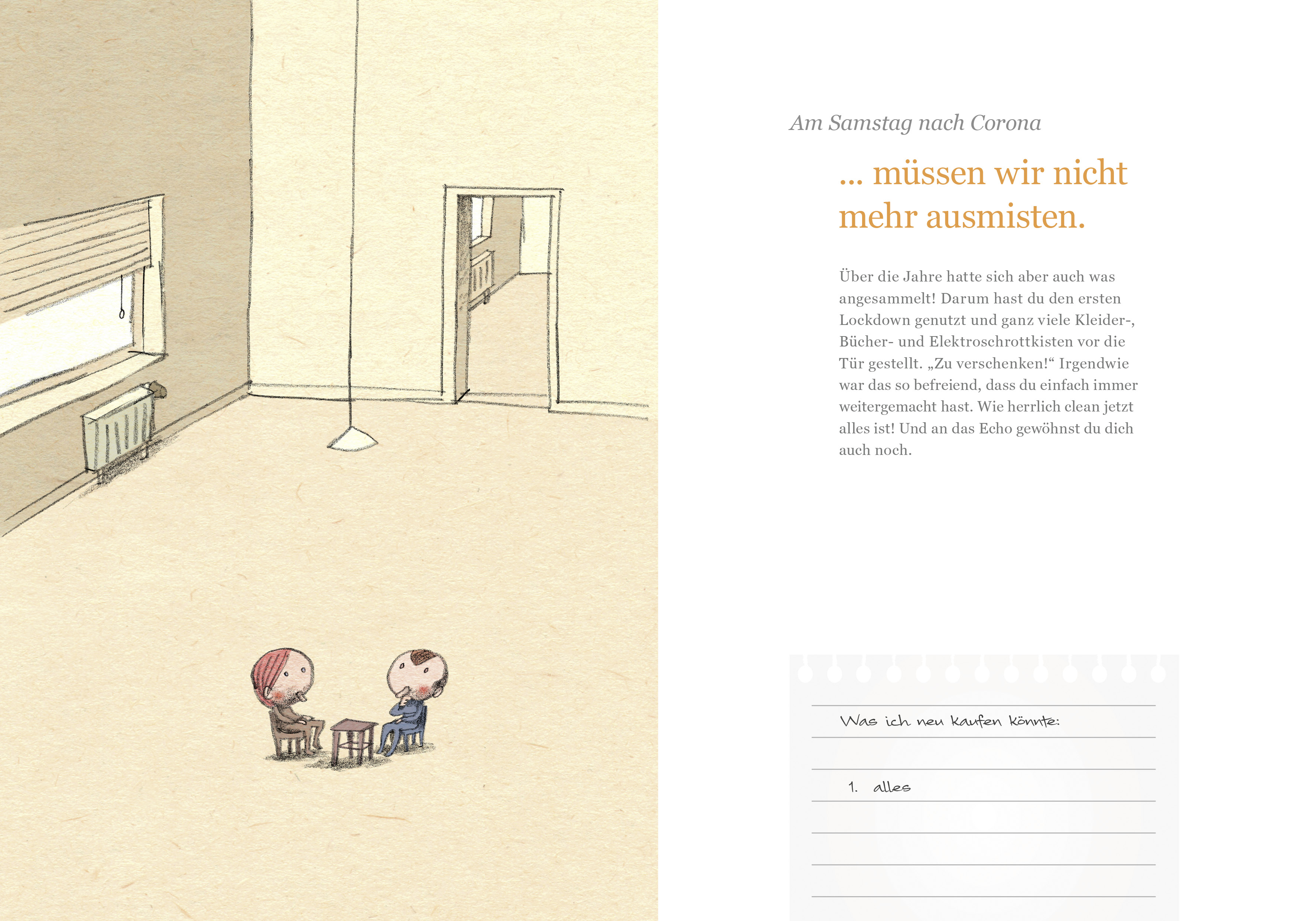 Direkt wildfremde Leute umarmen? Oder vorher noch schnell alten Hausstand zurückkaufen, der dem Aufräumwahn zum Opfer fiel? Dieses Büchlein ist die perfekte Hilfestellung für alle, die von der drohenden Freiheit überfordert sind. Es fasst zusammen, was wir endlich wieder dürfen und was wir - mit Abstand betrachtet - vielleicht doch gar nicht so sehr vermisst haben. Und es ist mit seinen nützlichen To-do-Listen zum Selbstergänzen das ideale Geschenk für liebe Freunde: einfach schon mal ausfüllen, damit sie wissen, was du am Samstag nach Corona endlich alles mit ihnen anstellen wirst.