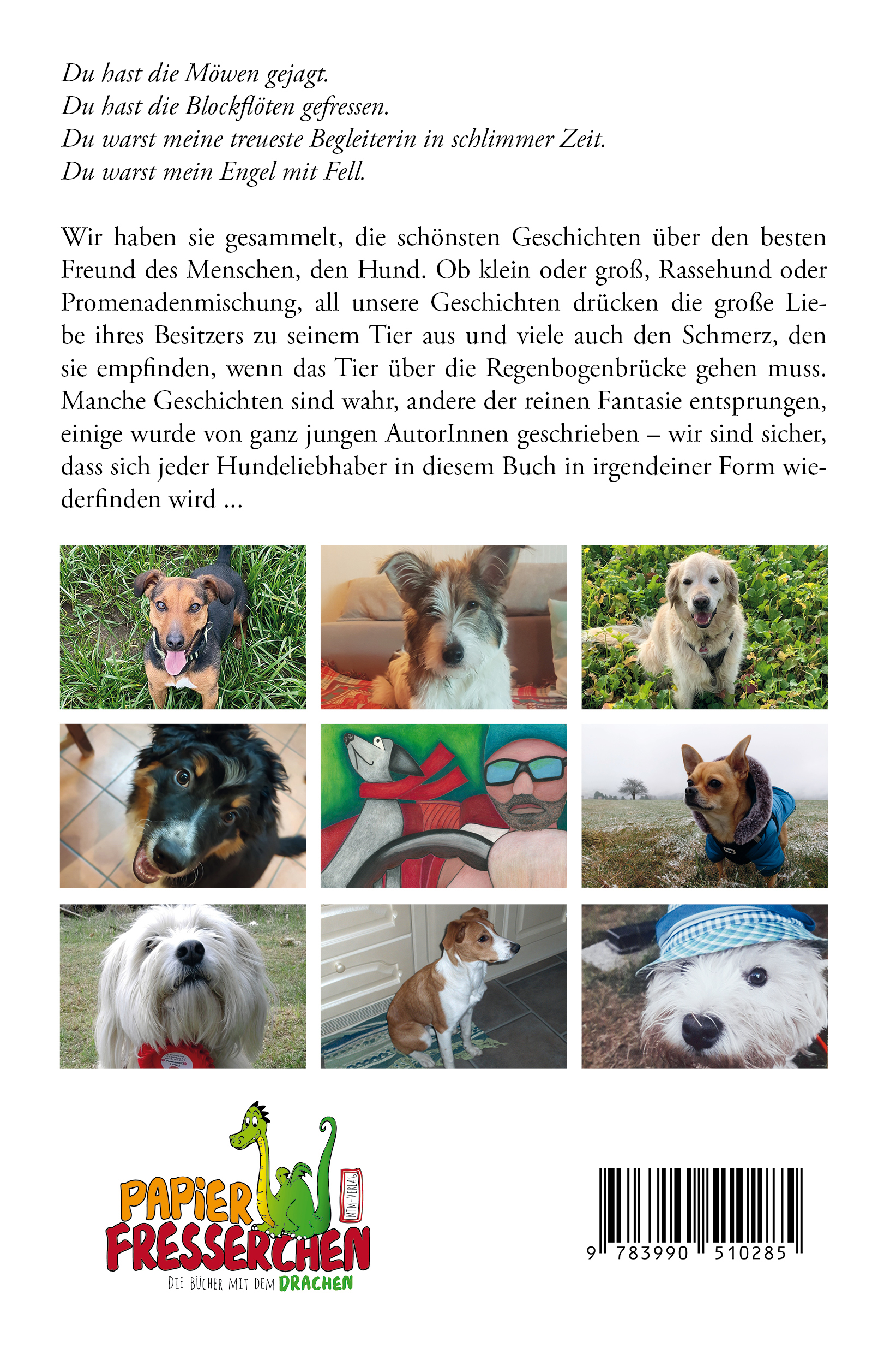 Du hast die Möwen gejagt.Du hast die Blockflöten gefressen.Du warst meine treueste Begleiterin in schlimmer Zeit.Du warst mein Engel mit Fell.Wir haben sie gesammelt, die schönsten Geschichten über den besten Freund des Menschen, den Hund. Ob klein oder groß, Rassehund oder Promenadenmischung, all unsere Geschichten drücken die große Liebe ihres Besitzers zu seinem Tier aus und viele auch den Schmerz, den sie empfinden, wenn das Tier über die Regenbogenbrücke gehen muss. Manche Geschichten sind wahr, andere der reinen Fantasie entsprungen, einige wurde von ganz jungen AutorInnen geschrieben - wir sind sicher, dass sich jeder Hundeliebhaber in diesem Buch in irgendeiner Form wiederfinden wird ...