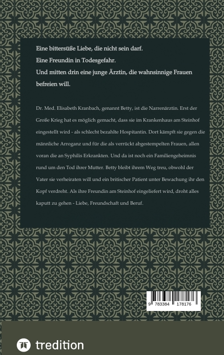 Eine bittersüße Liebe, die nicht sein darf.Eine Freundin in Todesgefahr.Und mitten drin eine junge Ärztin, die wahnsinnige Frauen befreien will.Dr. Med. Elisabeth Kranbach, genannt Betty, ist die Narrenärztin. Erst der Große Krieg hat es möglich gemacht, dass sie im Krankenhaus am Steinhof eingestellt wird - als schlecht bezahlte Hospitantin. Dort kämpft sie gegen die männliche Arroganz und für die als verrückt abgestempelten Frauen, allen voran die an Syphilis Erkrankten. Und da ist noch ein Familiengeheimnis rund um den Tod ihrer Mutter. Betty bleibt ihrem Weg treu, obwohl der Vater sie verheiraten will und ein britischer Patient unter Bewachung ihr den Kopf verdreht. Als ihre Freundin am Steinhof eingeliefert wird, droht alles kaputt zu gehen - Liebe, Freundschaft und Beruf.