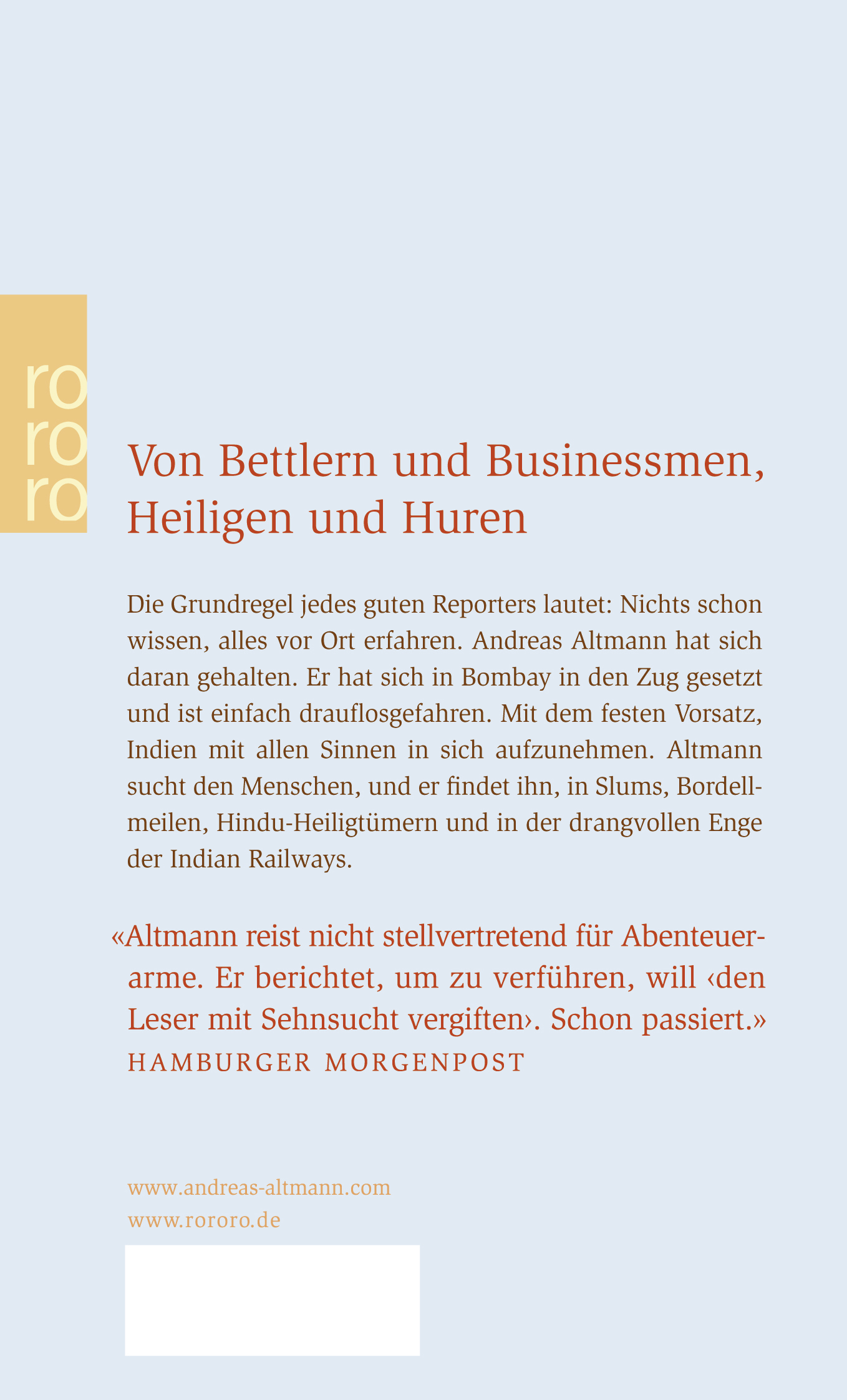 Andreas Altmann war Dressman, Schauspieler am Residenztheater München und am Schauspielhaus Wien, Jura- und Psychologiestudent, Gärtner, Taxifahrer, Privatchauffeur, Spüler, Kellner, Anlageberater, Straßenarbeiter. Er lebt heute als Auslandsreporter und Reiseschriftsteller in Paris. Unter anderem ist er ohne Geld von Berlin nach Paris gelaufen ("34 Tage/33Nächte"), durch Indien ("Notbremse nicht zu früh ziehen") und durch Südostasien ("Der Preis der Leichtigkeit") gereist. Zudem hat er Storys aus der weiten wilden Welt unter dem Titel "Getrieben" vorgelegt. Er war unterwegs in Kolumbien, Ecuador, Peru, Bolivien und Chile ("Reise durch einen einsamen Kontinent"). Andreas Altmann wurde mit dem 'Egon-Erwin-Kisch-Preis', dem 'Weltentdecker-Preis' und dem 'Seume-Literatur-Preis' ausgezeichnet.www.andreas-altmann.com