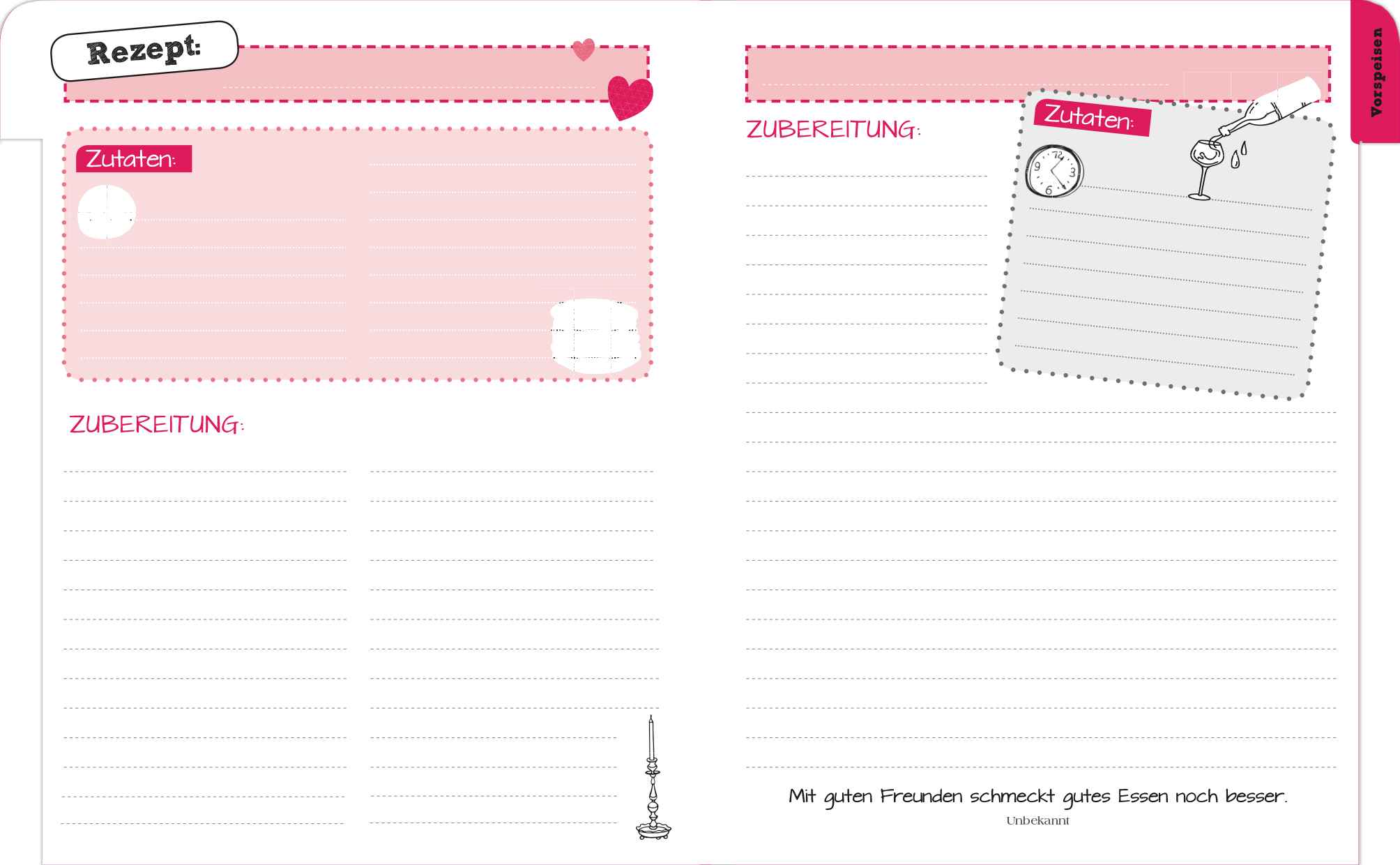 In diesem Eintragbuch können alle Lieblingsrezepte gesammelt werden. Schön sortiert mit einem Register nach Vorspeise, Hauptspeise und Nachspeise lassen sich die Rezepte auch schnell wiederfinden. Alle Zutaten und die genaue Zubereitung der Rezepte können im schönen Design festgehalten werden. Per Reißverschluss lassen sich auch weitere Notizen hübsch verschließen und zusammenhalten. So fällt nichts mehr aus dem Buch.