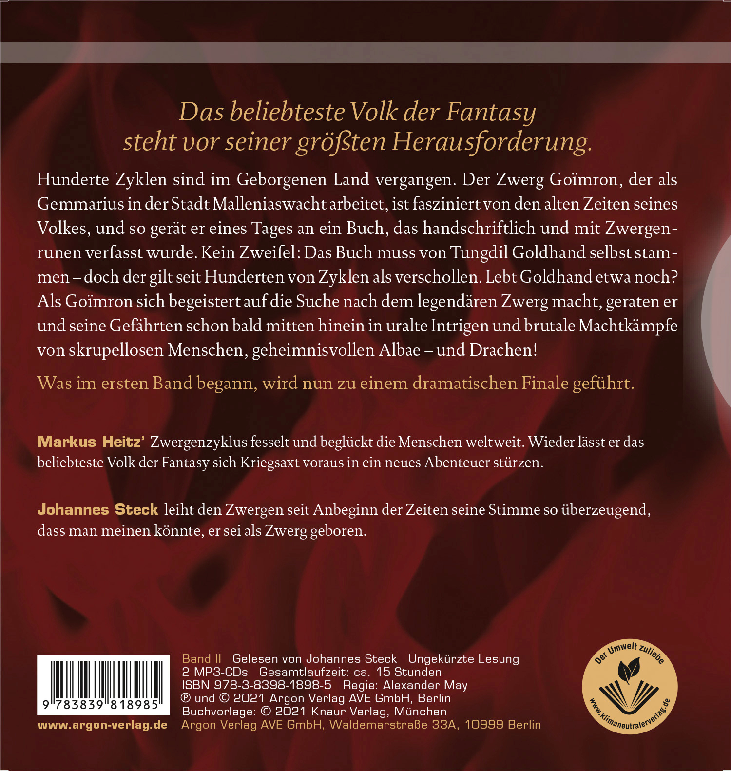 Das beliebteste Volk der Fantasy steht vor seiner größten Herausforderung. Was im ersten Band von "Die Rückkehr der Zwerge" begann, wird nun zu einem dramatischen Finale geführt. Johannes Steck leiht den Zwergen seit Anbeginn der Zeiten seine Stimme so überzeugend, dass man meinen könnte, er sei als Zwerg geboren.
