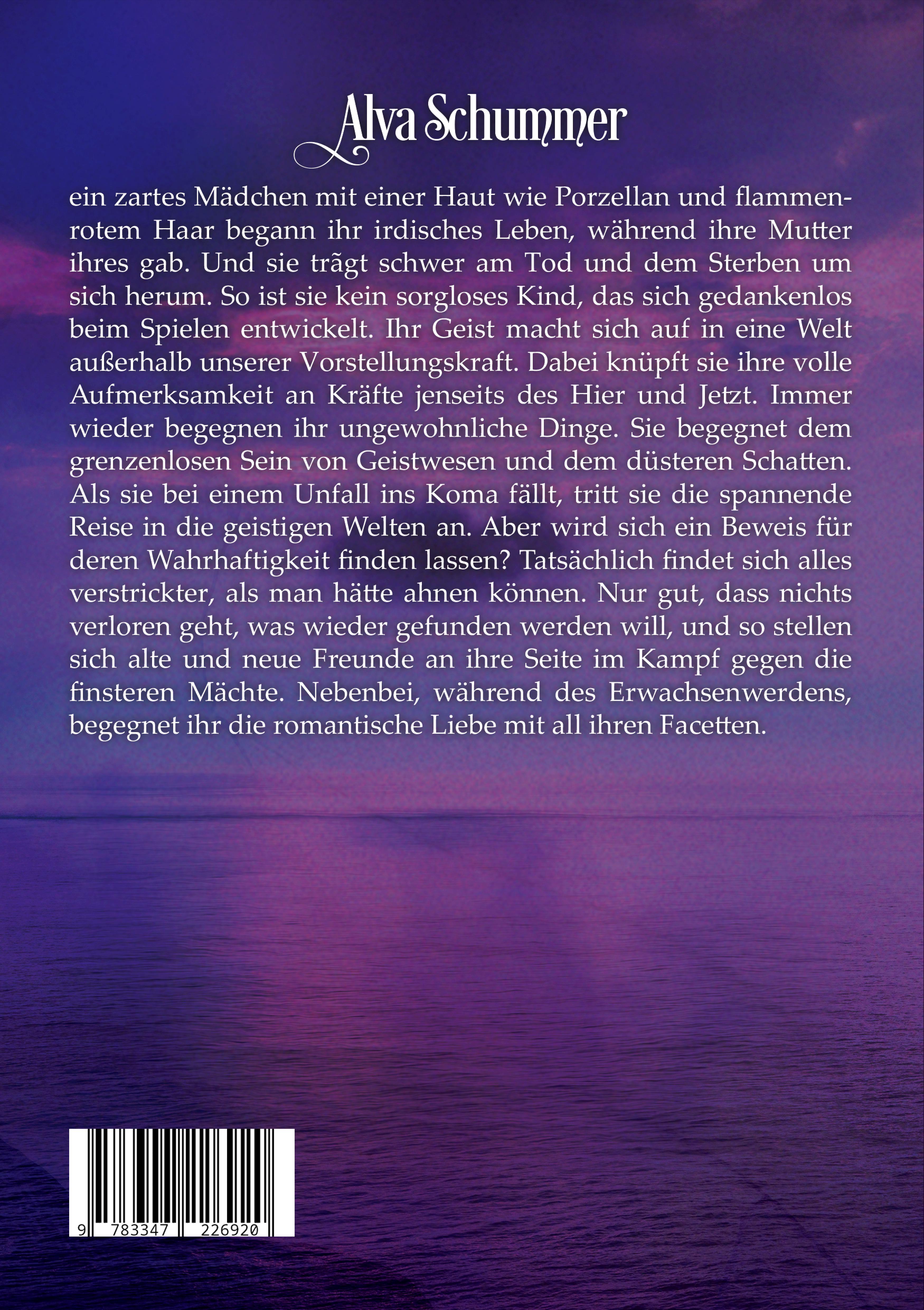 Alva Schummer - ein zartes Porzellanmädchen mit leuchtend roten Haaren begann dieses Leben, während ihre Mutter ihres gab. Und sie trägt schwer am Tod und dem Sterben um sich herum. So ist sie kein gewöhnliches Kind, das sich gedankenlos dem Spielen hingibt. Vielmehr macht sich ihr Geist auf in eine Welt außerhalb jeder Vorstellungskraft. Sie knüpft all ihre Aufmerksamkeit an Kräfte jenseits des Hier und Jetzt und immer häufiger begegnen ihr ungewöhnliche Dinge. Aber wird sich auch ein Beweis für deren Wahrhaftigkeit finden lassen? Tatsächlich ist alles verstrickter, als man je hätte ahnen können. Alva begegnet dem grenzenlosen Sein von Geistwesen und einem unheimlichen Schatten. Nur gut, dass nichts verloren geht, was wiedergefunden werden will, und so stellen sich alte, aber auch neue Freunde an ihre Seite im Kampf gegen düstere Mächte. Und nebenbei, während des Erwachsenwerdens, begegnet ihr die romantische Liebe in all ihren Facetten.