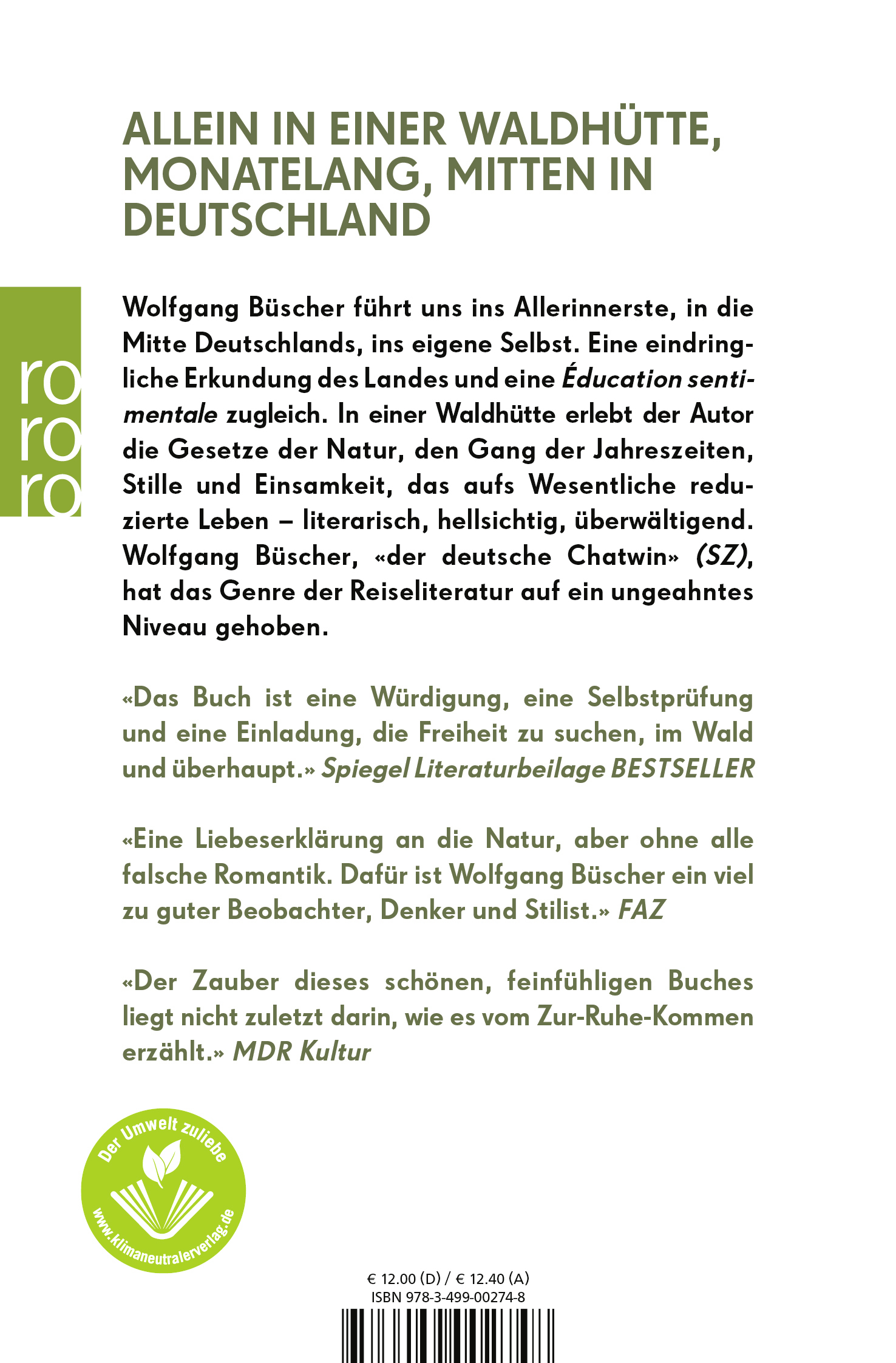 | Schlagworte | Besinnung • Deutschland • Einfachheit • Einkehr • Einsamkeit • Entschleunigung • Erkundung • Heimkehr • Hütte • Jahreszeiten • Land • Natur • Provinz • Reisebericht • Reiseerzählung • Reiseliteratur • Rückzug • Wald • waldgang • Waldleben • Wesentliches • Wildnis |