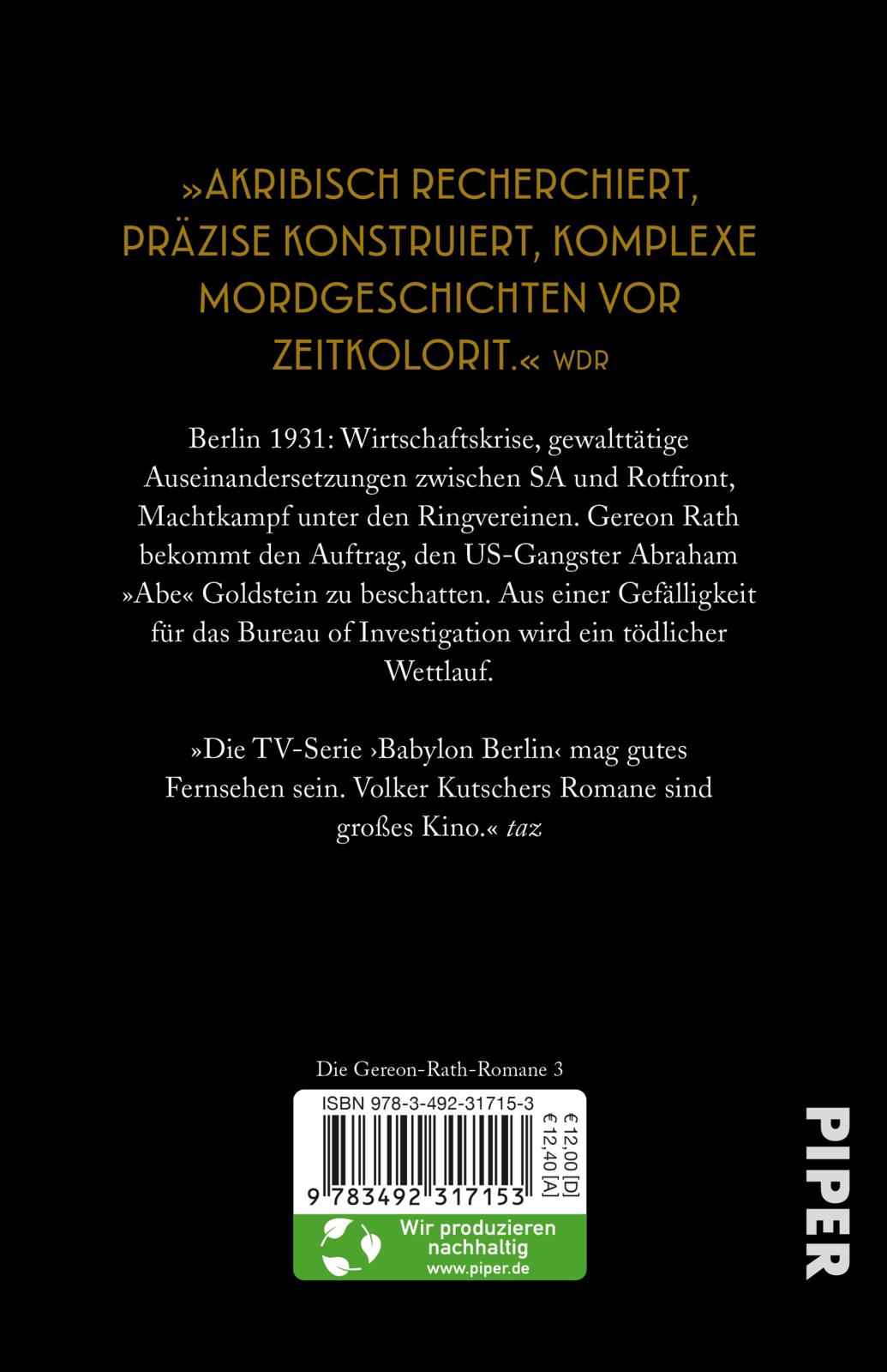 Berlin 1931: Wirtschaftskrise, gewalttätige Auseinandersetzungen zwischen SA und Rotfront, Machtkampf unter den Ringvereinen. Gereon Rath bekommt vom FBI den Auftrag, den US-Gangster Abraham »Abe« Goldstein zu beschatten, und ahnt auf seinem Posten nicht, dass dieser sich frei und bewaffnet in der Stadt bewegt. Als der Unterweltboss Marlow Rath zu einer privaten Ermittlung zwingt, gerät er zwischen die Fronten des Bandenkriegs. Dann lässt seine Noch-immernicht-Verlobte Charly Ritter eine Obdachlose bei der Vernehmung entwischen, ihre Ermittlungen berühren sich - und sie bekommen richtig Krach.