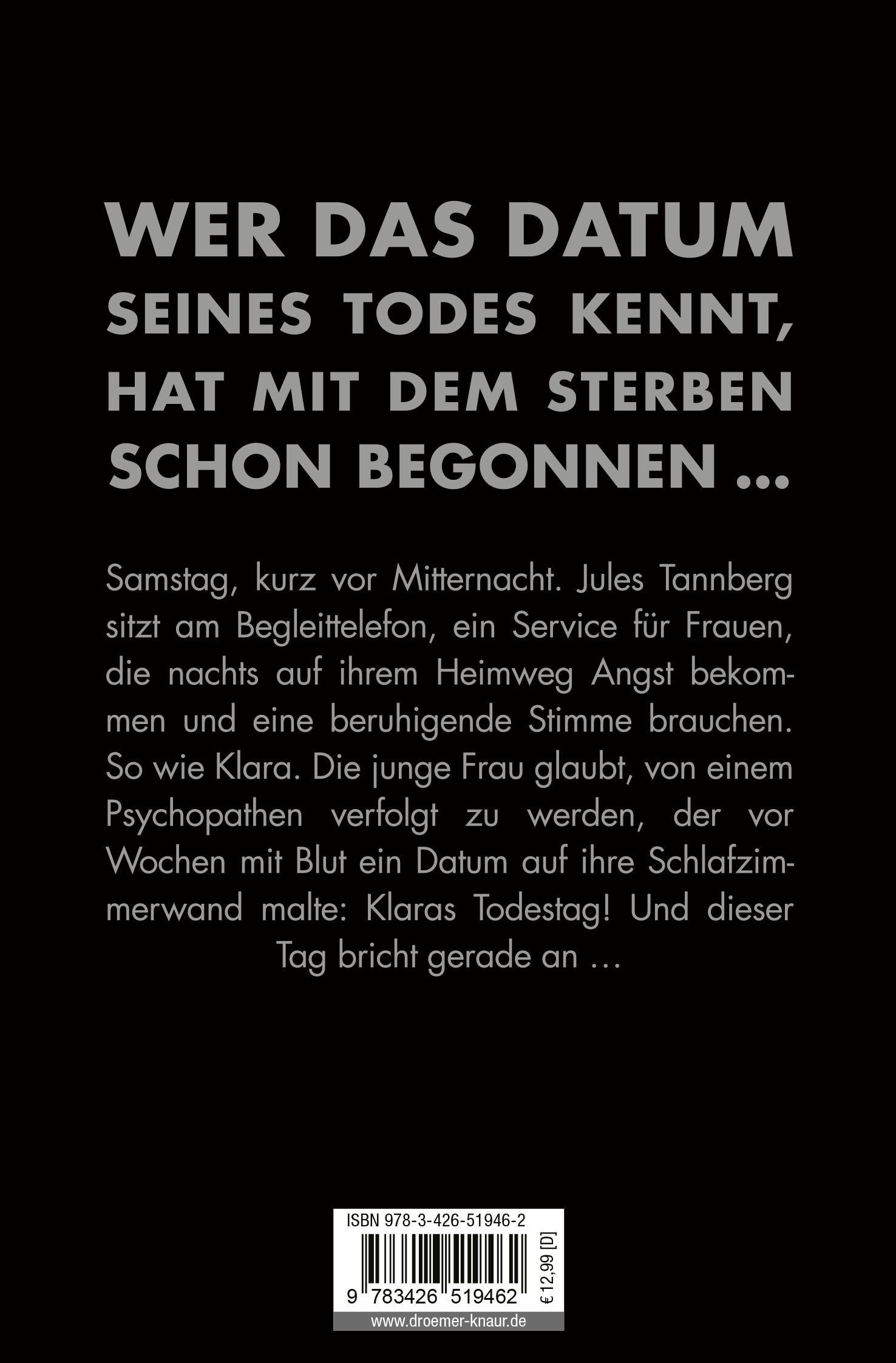 Sie glaubt, von einem Mann verfolgt zu werden, der sie schon einmal überfallen hat und der mit Blut ein Datum auf ihre Schlafzimmerwand malte: Klaras Todestag! Und dieser Tag bricht in nicht einmal zwei Stunden an ...