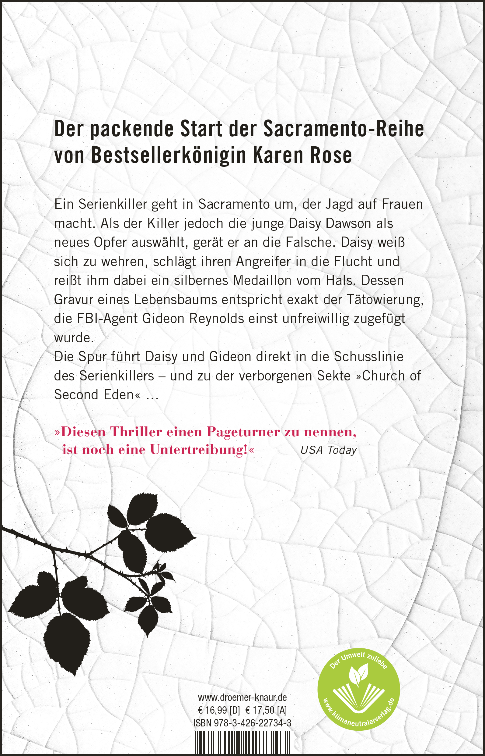 Der perfekte Page-Turner: ein Serienkiller, der Jagd auf Frauen macht, und eine brutale Sekte. Die amerikanische Autorin Karen Rose ist mit ihren Thriller-Reihen (u. a. die »Dornen«-Thriller und die Baltimore-Reihe) regelmäßiger Gast auf den Bestseller-Listen. Gekonnt verbindet sie absolute Hochspannung mit romantisch-prickelnden Liebesgeschichten.