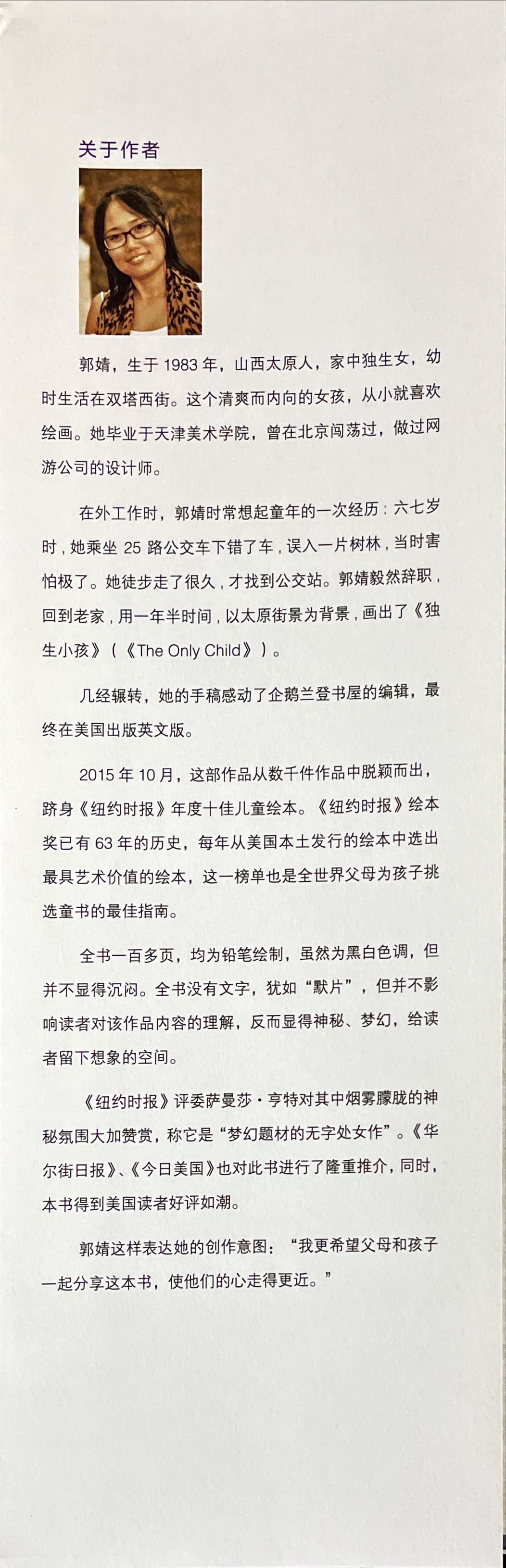 Die Malerin Guo Jing wuchs in der Ära der Ein-Kind-Politik Chinas auf. Die Entstehung dieses wortlosen Bilderbuchs beruht auf ihrer einsamen Erinnerung und Fantasie in ihrer Kindheit. Sie hat die reiche und tiefe emotionale Welt eines Kindes auf brillante Weise festgehalten und zeigt Einsamkeit, Sehnsucht, Liebe und Glück.