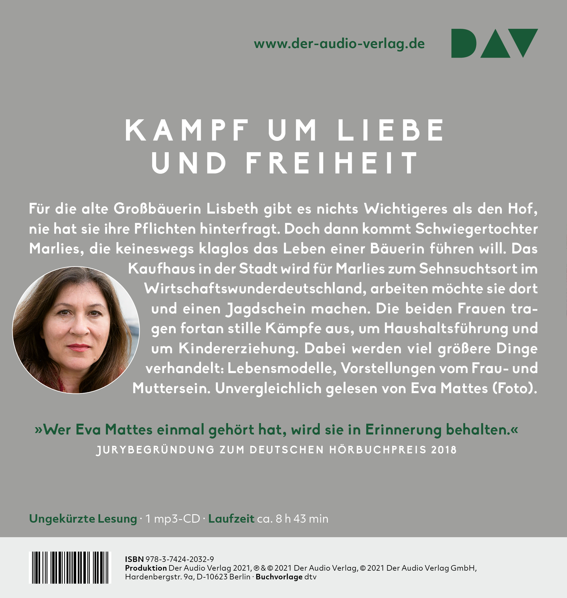 »Ihre Stimme gibt dem Text Klang und den Figuren einen Körper. Wer Eva Mattes einmal gehört hat, wird sie in Erinnerung behalten.« Jurybegründung zum Deutschen Hörbuchpreis 2018