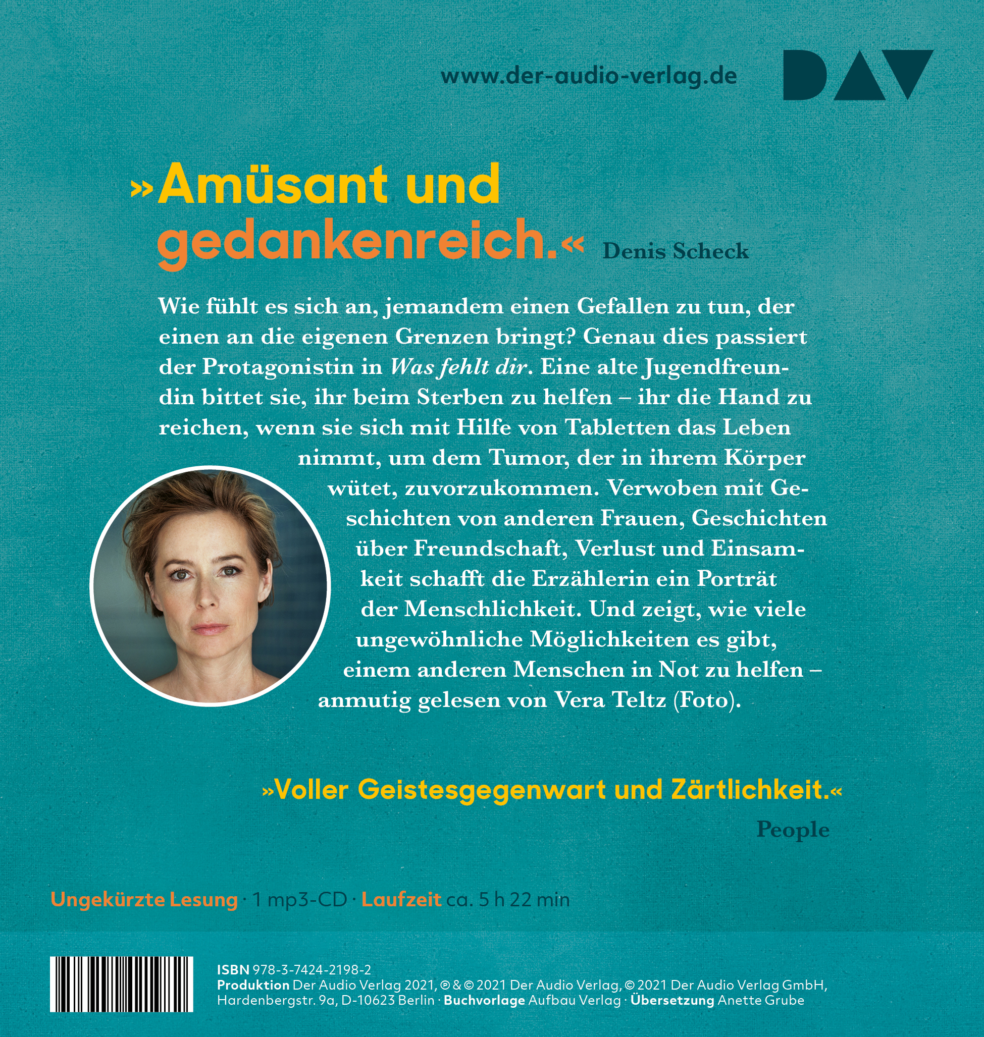 Vera Teltz, geboren 1971, ist eine beliebte Hörbuch- und Synchronsprecherin. Ihre ausdrucksstarke Stimme leiht sie u.a. Filmgrößen wie Helena Bonham Carter, Naomi Harris, Alicia Keys und Elizabeth Banks. Zuletzt hat sie für DAV »Die Schweigende« von Ellen Sandberg eingelesen.