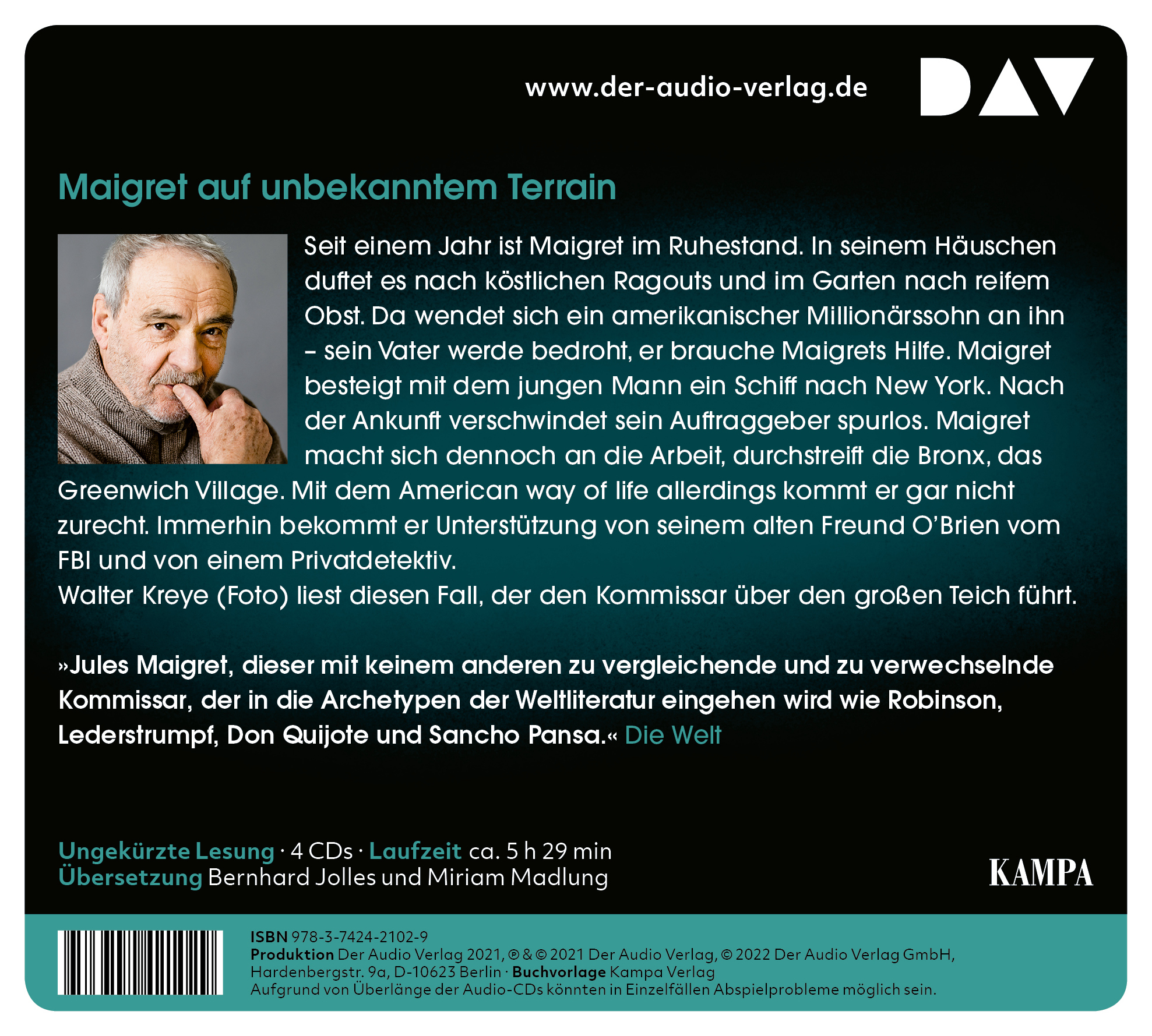Walter Kreye, geboren 1942, spielte an Bühnen wie dem Hamburger Schauspielhaus, dem Thalia Theater, dem Staatstheater Stuttgart sowie an der Schaubühne Berlin. Der mit dem Grimme-Preis ausgezeichnete Schauspieler wurde durch zahlreiche Film- und Fernsehrollen bekannt, u.a. als Hauptkommissar Kress in »Der Alte« und durch die Netflix-Serie »Dark«. Der beliebte Hörbuchsprecher liest alle Fälle von Kommissar Maigret in der Edition Simenon ein.
