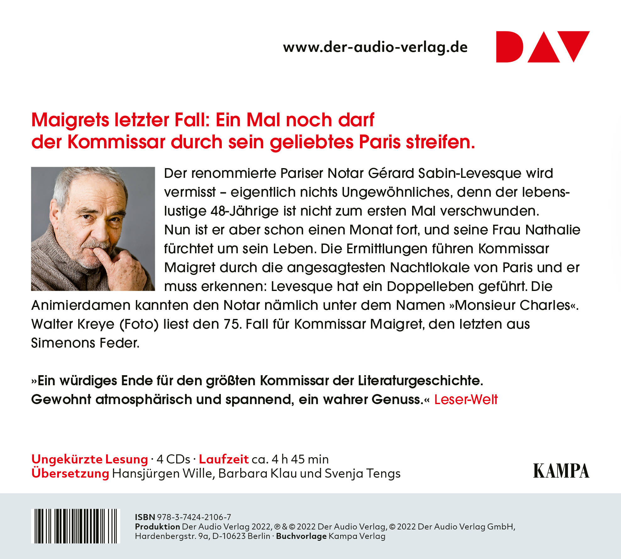 Walter Kreye, geboren 1942, spielte an Bühnen wie dem Hamburger Schauspielhaus, dem Thalia Theater, dem Staatstheater Stuttgart sowie an der Schaubühne Berlin. Der mit dem Grimme-Preis ausgezeichnete Schauspieler wurde durch zahlreiche Film- und Fernsehrollen bekannt, u.a. als Hauptkommissar Kress in »Der Alte« und durch die Netflix-Serie »Dark«. Der beliebte Hörbuchsprecher liest alle Fälle von Kommissar Maigret in der Edition Simenon ein.