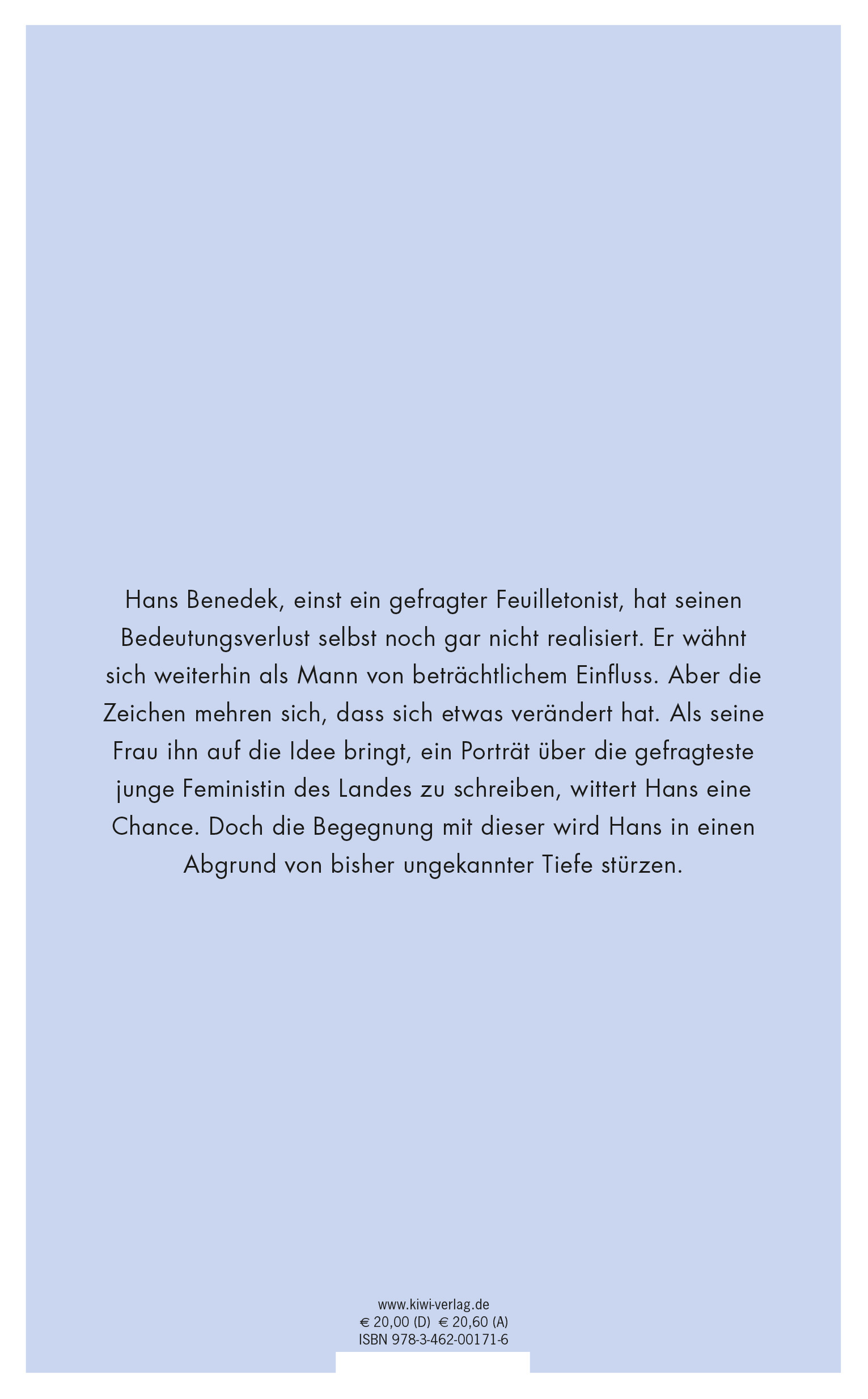 Als seine Frau ihn auf die Idee bringt, ein Portrait über die gefragteste junge Feministin des Landes zu schreiben, wittert Hans seine Chance. Doch die Begegnung mit ihr wird Hans in einen Abgrund von bisher ungekannter Tiefe stürzen.