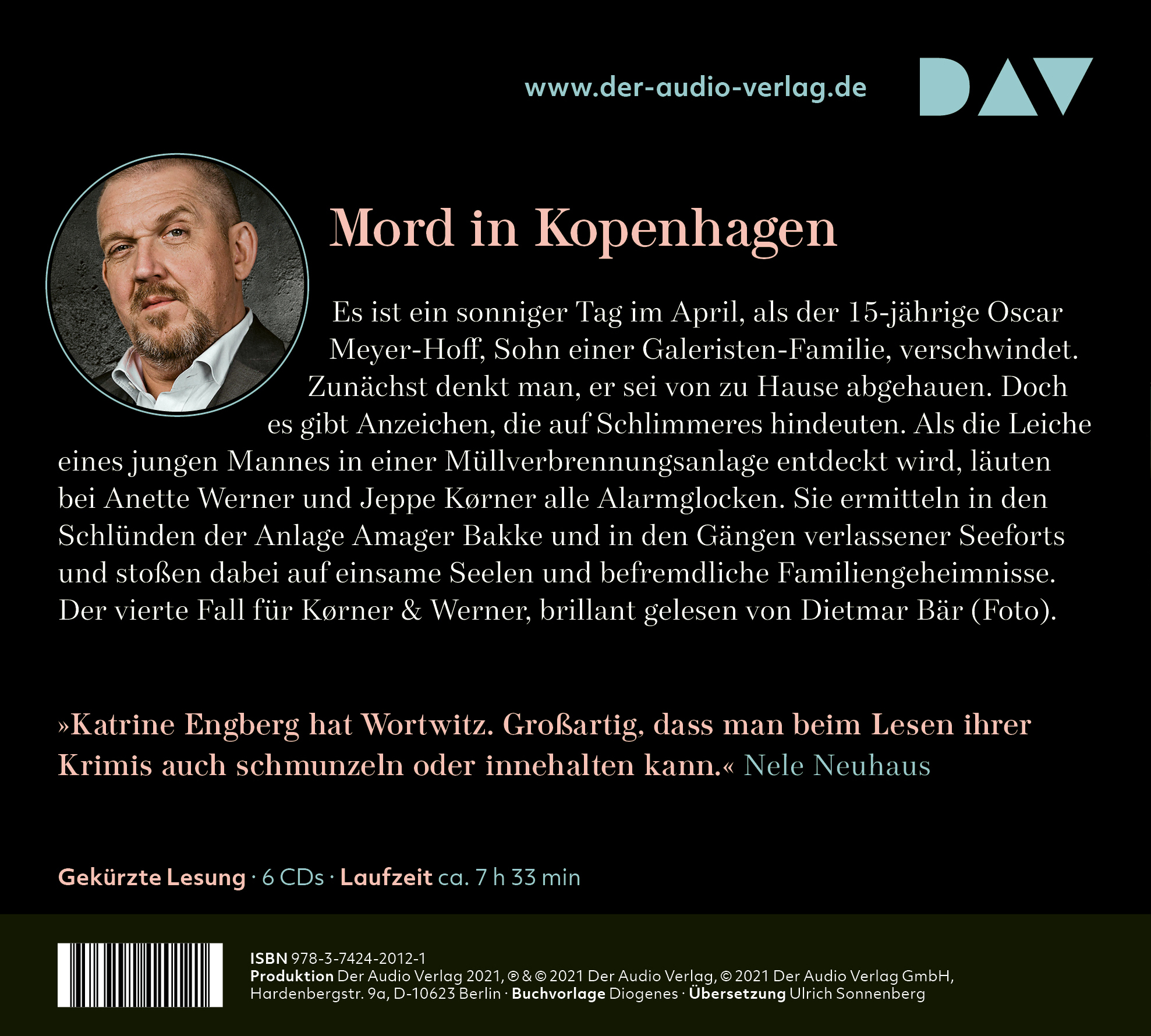 Dietmar Bär, geboren 1961, ist einer der beliebtesten deutschen Schauspieler. Seit 1997 ist er in der Rolle des Kölner »Tatort«-Kommissars Freddy Schenk zu sehen, für die er mit dem Deutschen Fernsehpreis ausgezeichnet wurde. Als Sprecher wurde er u.a. mit seinen Lesungen von Håkan Nesser und Stieg Larsson bekannt. Für DAV liest er die Kopenhagen-Serie von Katrine Engberg ein.