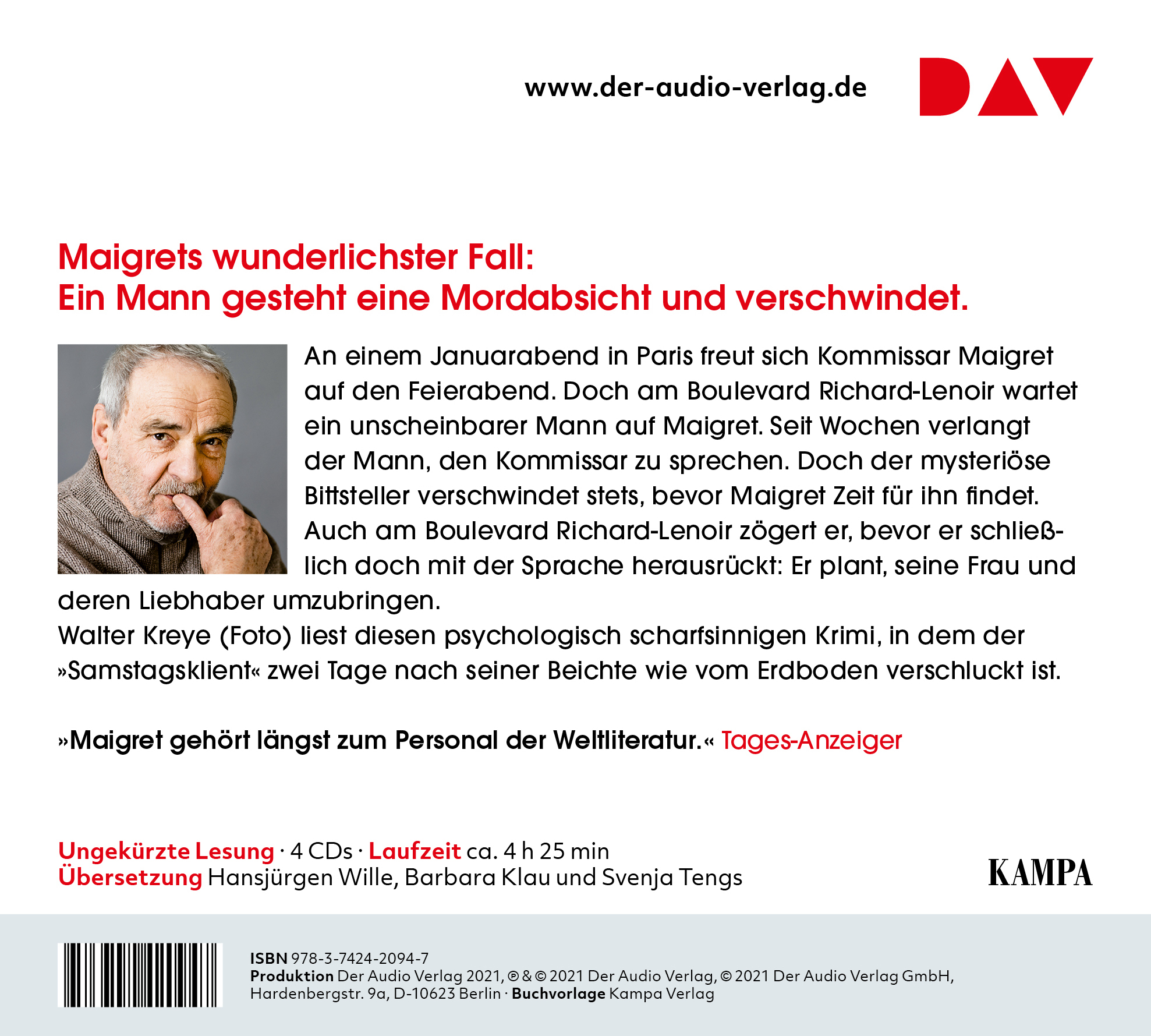 Walter Kreye, geboren 1942, spielte an Bühnen wie dem Hamburger Schauspielhaus, dem Thalia Theater, dem Staatstheater Stuttgart sowie an der Schaubühne Berlin. Der mit dem Grimme-Preis ausgezeichnete Schauspieler wurde durch zahlreiche Film- und Fernsehrollen bekannt, u.a. als Hauptkommissar Kress in »Der Alte« und durch die Netflix-Serie »Dark«. Der beliebte Hörbuchsprecher liest alle Fälle von Kommissar Maigret in der Edition Simenon ein.