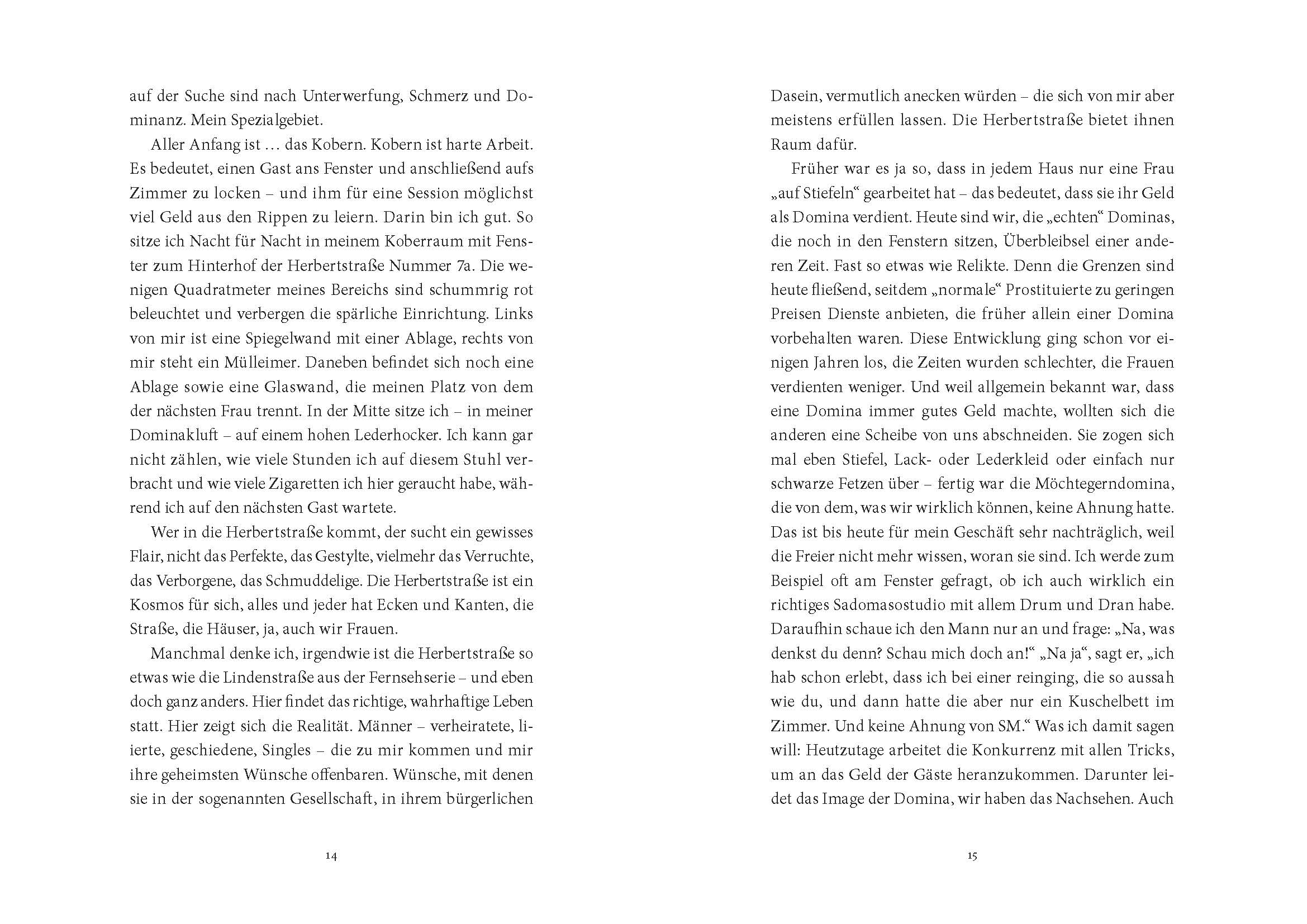 Die Herbertstraße, eine 60 Meter lange Gasse mitten im Hamburger Rotlichtbezirk, an den Zugängen begrenzt von Sichtblenden. In den Fenstern präsentieren sich die Prostituierten den flanierenden Freiern. Eine von ihnen ist Manuela Freitag, seit mehr als 30 Jahren arbeitet sie hier. Sie ist die dienstälteste Domina der Herbertstraße. Nichts ist ihr fremd, keine Begierde, keine Obsession. Aber es gibt auch die private Manuela, die fürsorgliche Mutter und treue Freundin - eine Frau, die manchmal auch von einem ganz gewöhnlichen Leben träumt. In ihrem Buch erzählt sie, wo sie herkommt, wie sie aufwuchs und wie sie mit 13 den ersten Schritt ins Milieu tat. Wie sie sich später von Zuhältern befreite und zur Domina wurde. Sie nimmt uns mit in das Mysterium Herbertstraße und zeichnet dabei ein eindrucksvolles, facettenreiches Bild von den Bedürfnissen, den Sehnsüchten und Abgründen unserer Gesellschaft.