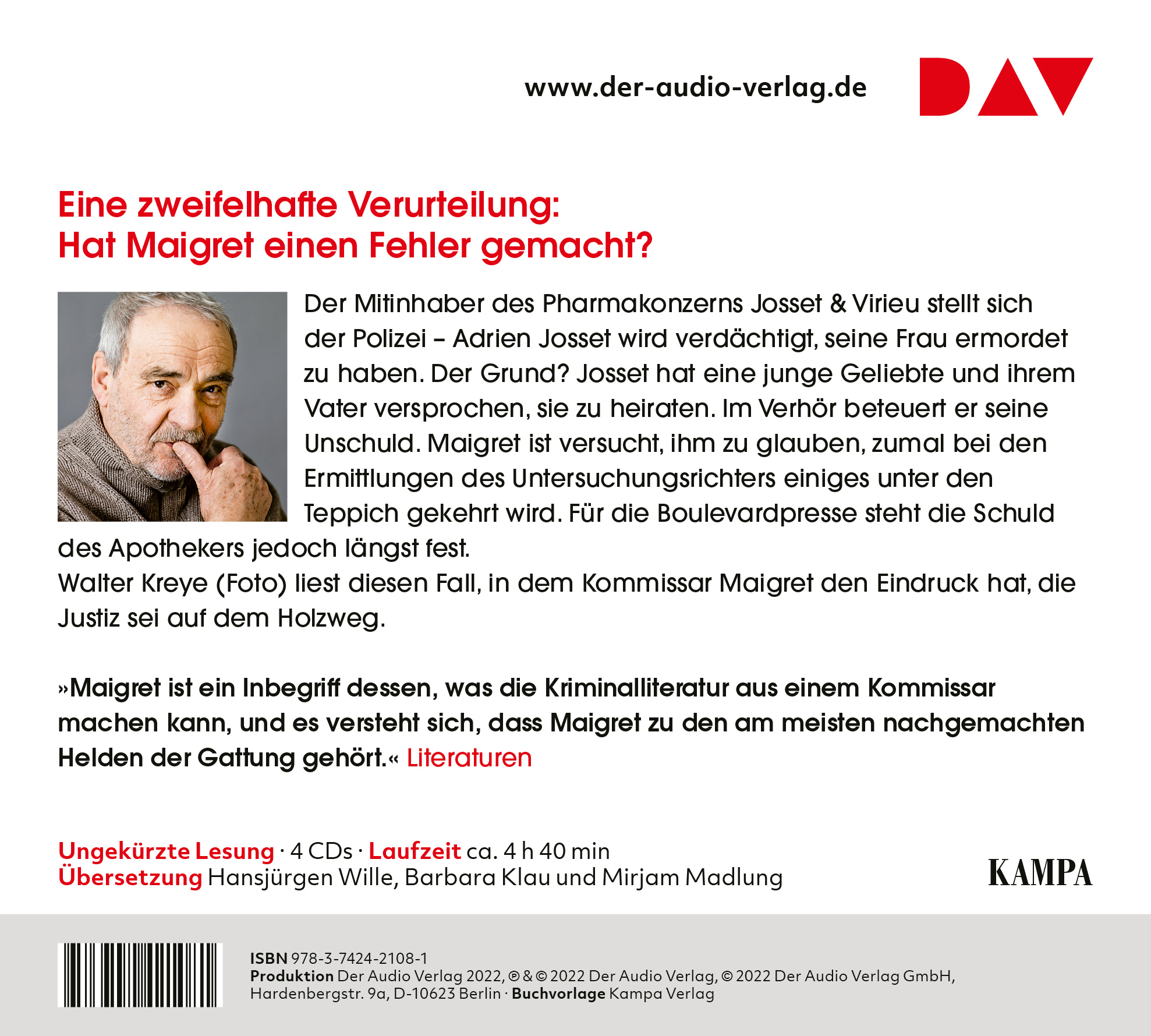 »Walter Kreye ist der neue Maigret.« Süddeutsche Zeitung »Simenon ist ein Rauschmittel, das ist eine Ursache seines Welterfolgs.« Georg Hensel, F. A. Z. »Hörgenuss für alle, die sich bei einem Krimi erholen wollen: Die Mischung aus französischem Retro-Charme, psychologischem Tiefgang und der warmen Stimme von Walter Kreye bietet zugleich Spannung und Entspannung.« Bayerischer Rundfunk