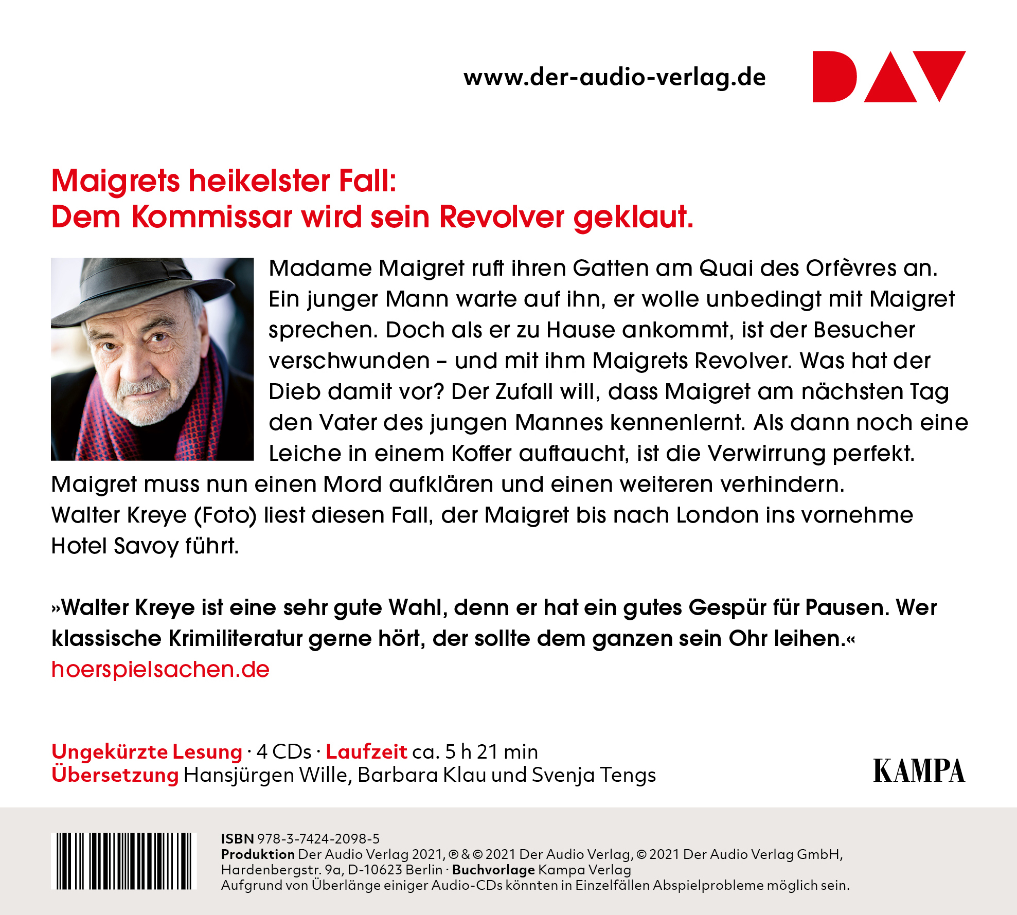 Walter Kreye, geboren 1942, spielte an Bühnen wie dem Hamburger Schauspielhaus, dem Thalia Theater, dem Staatstheater Stuttgart sowie an der Schaubühne Berlin. Der mit dem Grimme-Preis ausgezeichnete Schauspieler wurde durch zahlreiche Film- und Fernsehrollen bekannt, u.a. als Hauptkommissar Kress in »Der Alte« und durch die Netflix-Serie »Dark«. Der beliebte Hörbuchsprecher liest alle Fälle von Kommissar Maigret in der Edition Simenon ein.