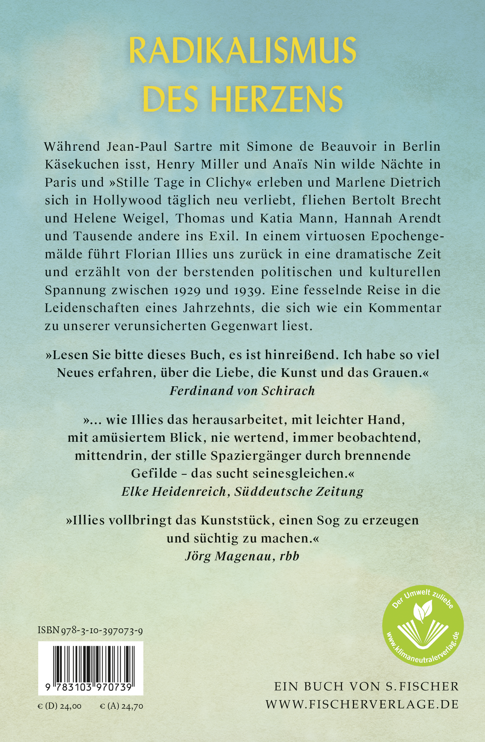 Als Jean-Paul Sartre mit Simone de Beauvoir im Kranzler-Eck in Berlin Käsekuchen isst, Henry Miller und Anaïs Nin wilde Nächte in Paris und »Stille Tage in Clichy« erleben, F. Scott Fitzgerald und Ernest Hemingway sich in New York in leidenschaftliche Affären stürzen, fliehen Bertolt Brecht und Helene Weigel wie Katia und Thomas Mann ins Exil. Genau das ist die Zeit, in der die Nationalsozialisten die Macht in Deutschland ergreifen, Bücher verbrennen und die Gewalt gegen Juden beginnt.