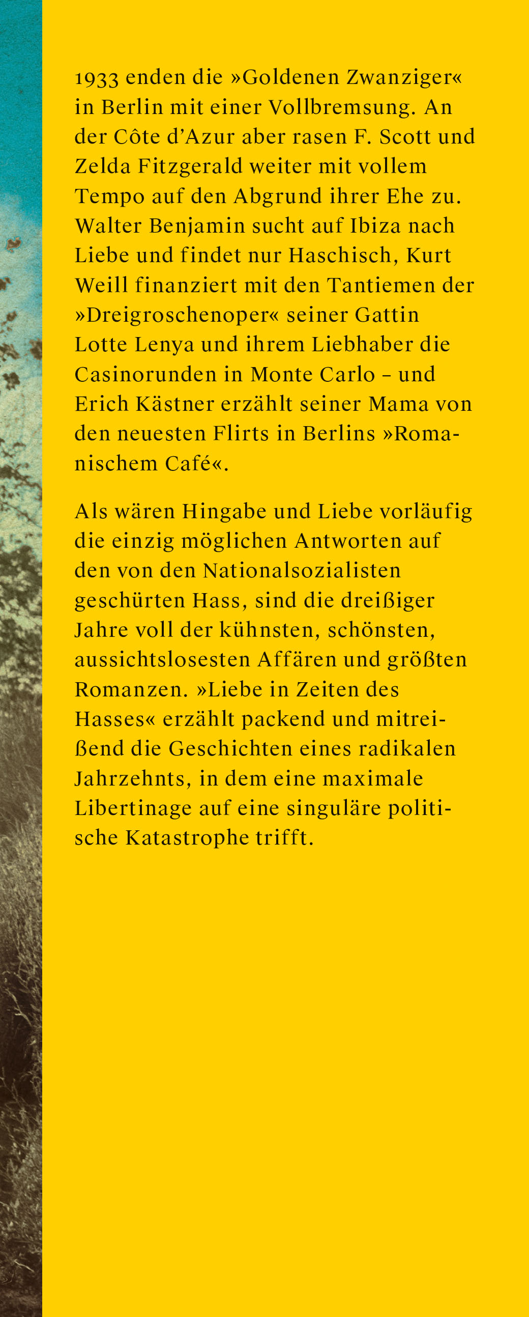 1933 enden die »Goldenen Zwanziger« mit einer Vollbremsung. Florian Illies führt uns zurück in die Epoche einer singulären politischen Katastrophe, um von den größten Liebespaaren der Kulturgeschichte zu erzählen: In Berlin, Paris, im Tessin und an der Riviera stemmen sich die großen Helden der Zeit gegen den drohenden Untergang. Eine mitreißend erzählte Reise in die Vergangenheit, die sich wie ein Kommentar zu unserer verunsicherten Gegenwart liest: Liebe in Zeiten des Hasses.