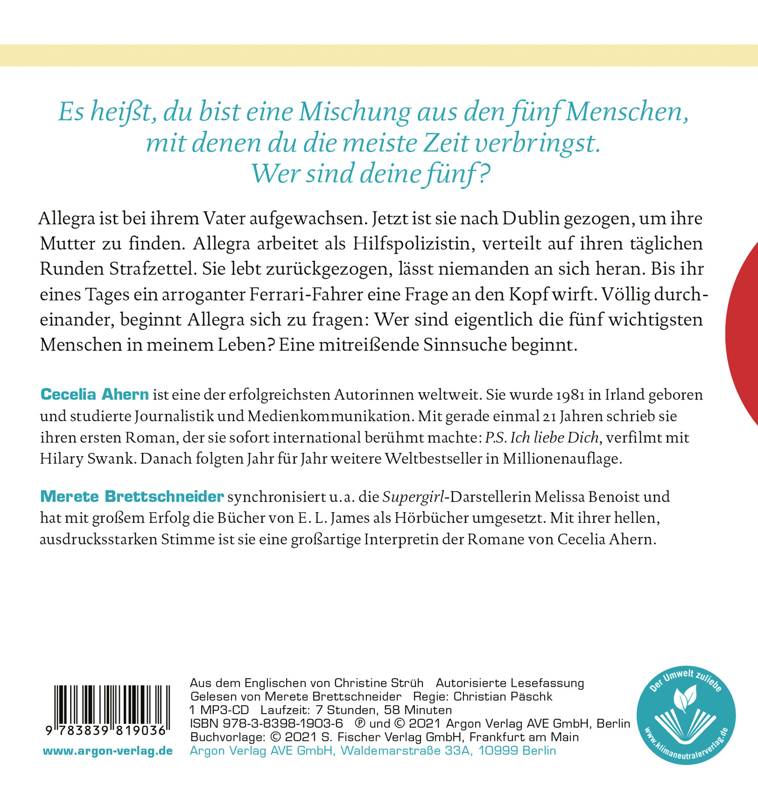 Bis ihr eines Tages ein arroganter Ferrari-Fahrer eine Frage an den Kopf wirft. Völlig durcheinander, beginnt Allegra sich zu fragen: Wer sind eigentlich die fünf wichtigsten Menschen in meinem Leben? Eine mitreißende Sinnsuche beginnt.