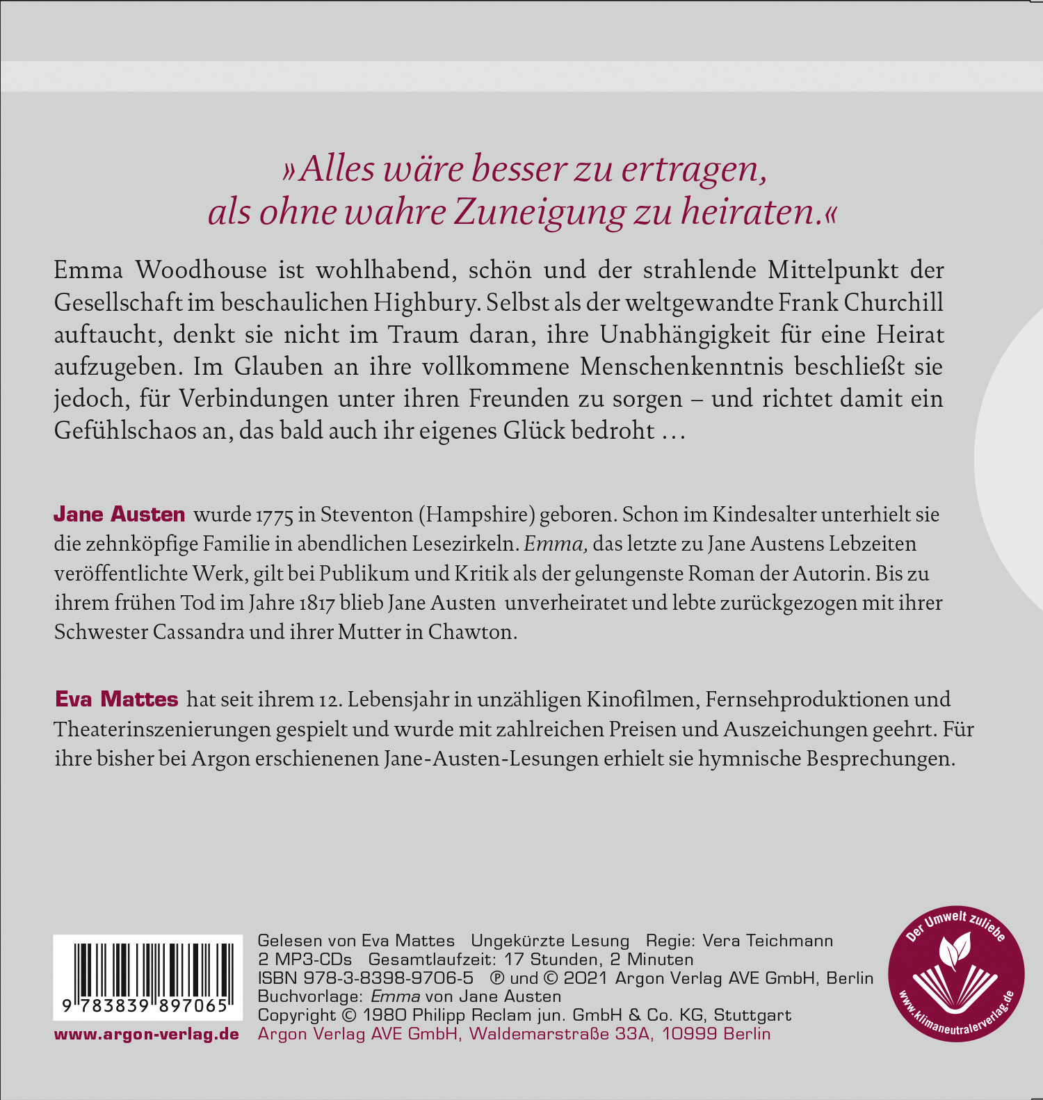 Eva Mattes steht seit ihrem zwölften Lebensjahr auf der Bühne und vor der Kamera. Sie hat in vielen Kinofilmen, Fernsehfilmen und Theaterinszenierungen mitgespielt und wurde mit zahlreichen Preisen und Auszeichnungen geehrt. Ihre ungekürzten Jane-Austen-Lesungen zählen zum Schönsten, was die deutschsprachige Hörbuchlandschaft zu bieten hat.